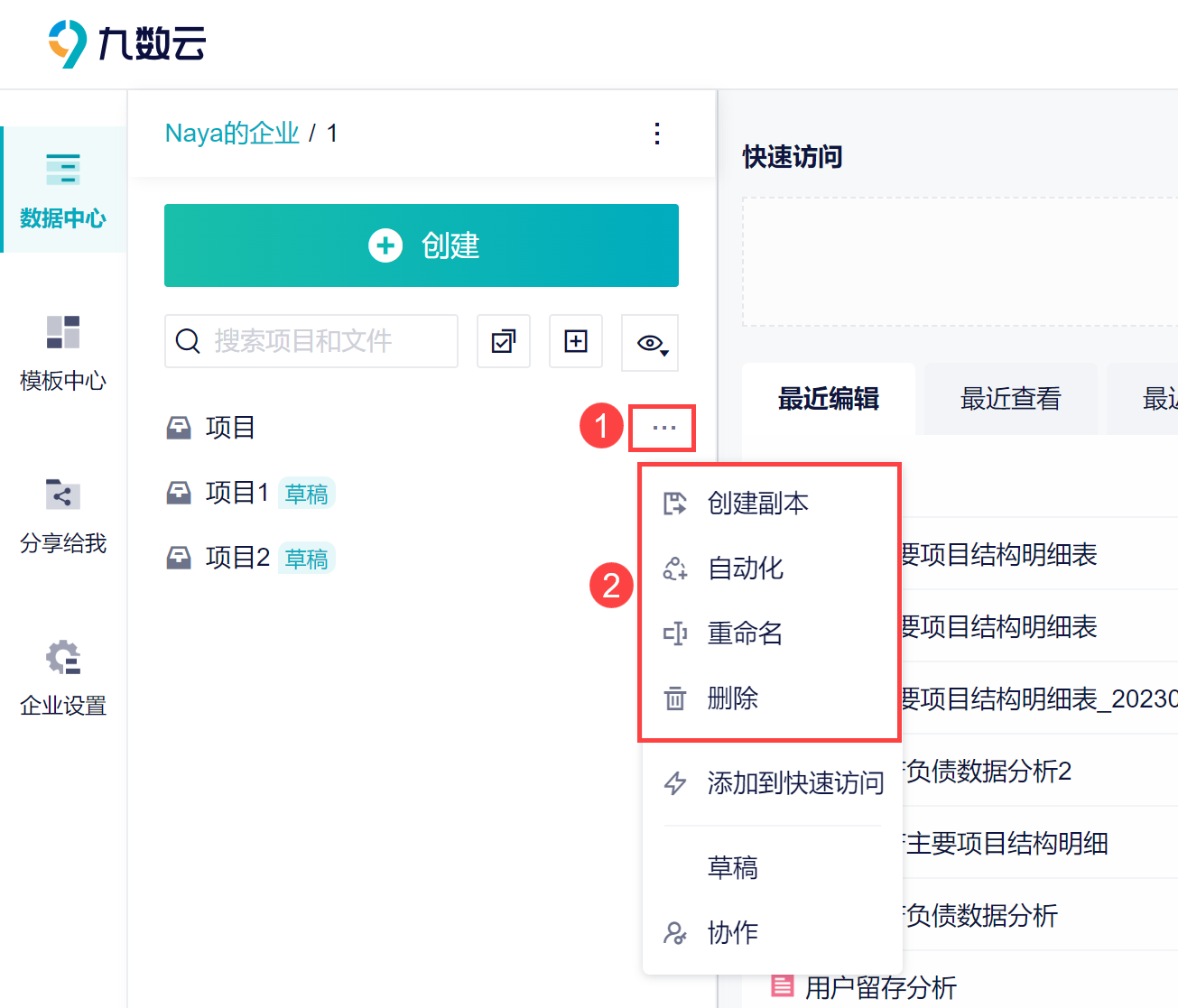 在九数云中,「项目」就像是一个分析的容器,放置着分析表、故事板、仪表板。可以创建多个项目对不同的分析进行分类和管理。