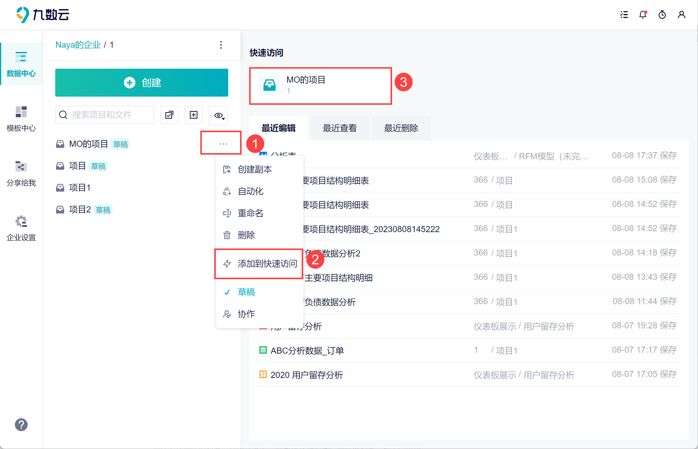 如果项目较多的话,可以将经常访问的项目方式在「快速访问」区域,点击区域内的项目即可快速进入该项目内。