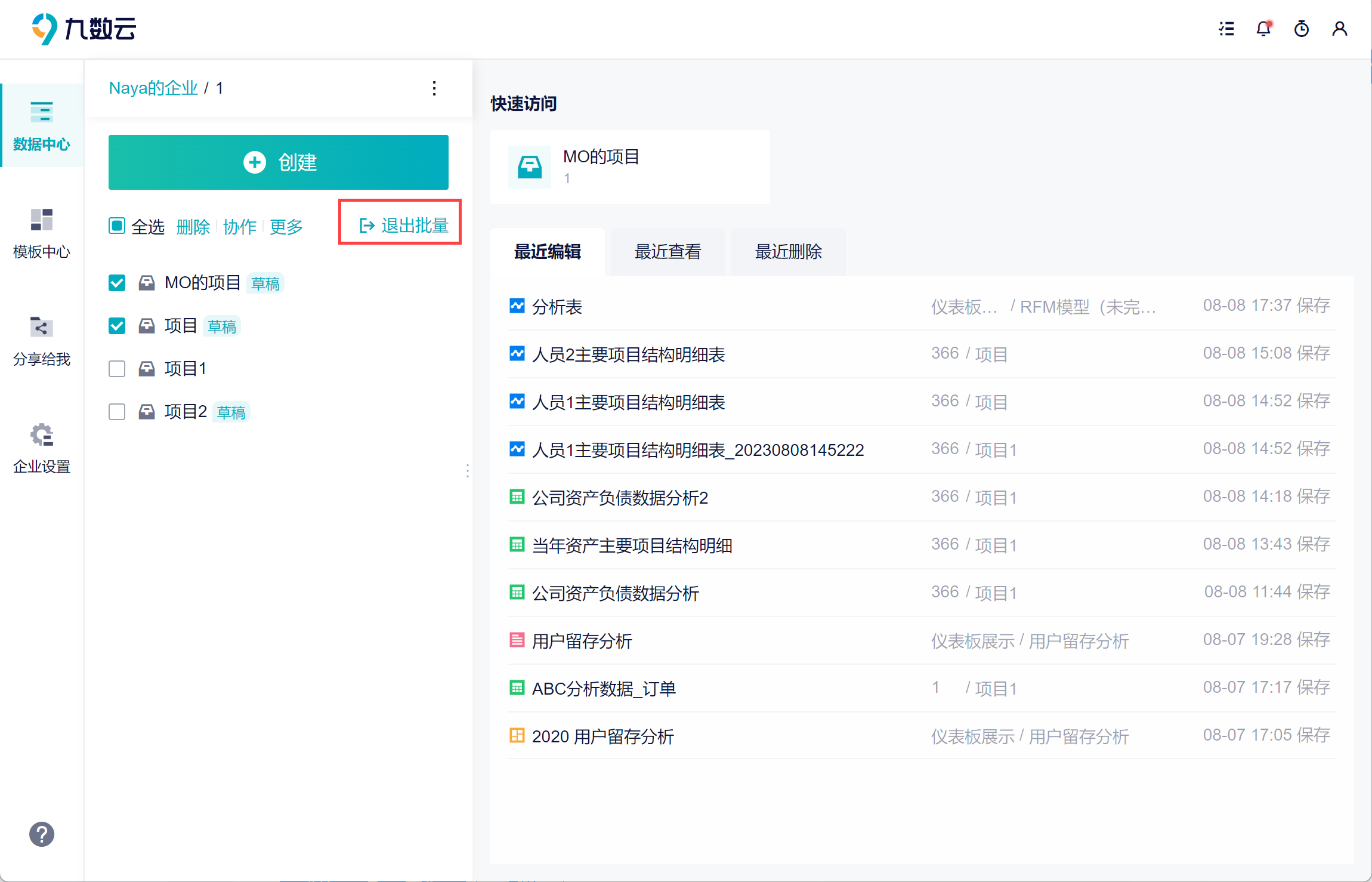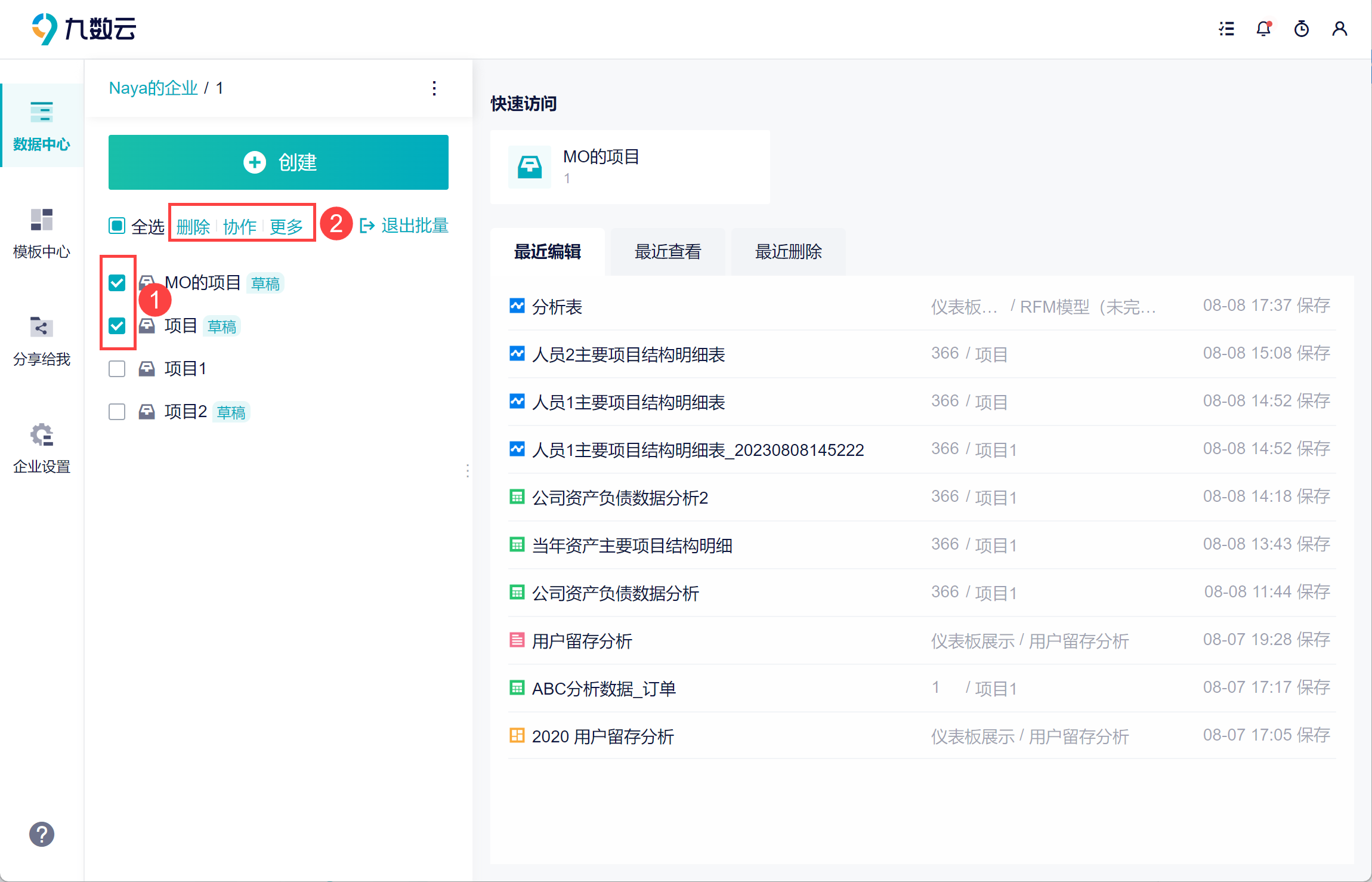 九数云还支持批量管理列表中的项目,同时对多个项目进行操作,省去重复设置的步骤,提高效率。
