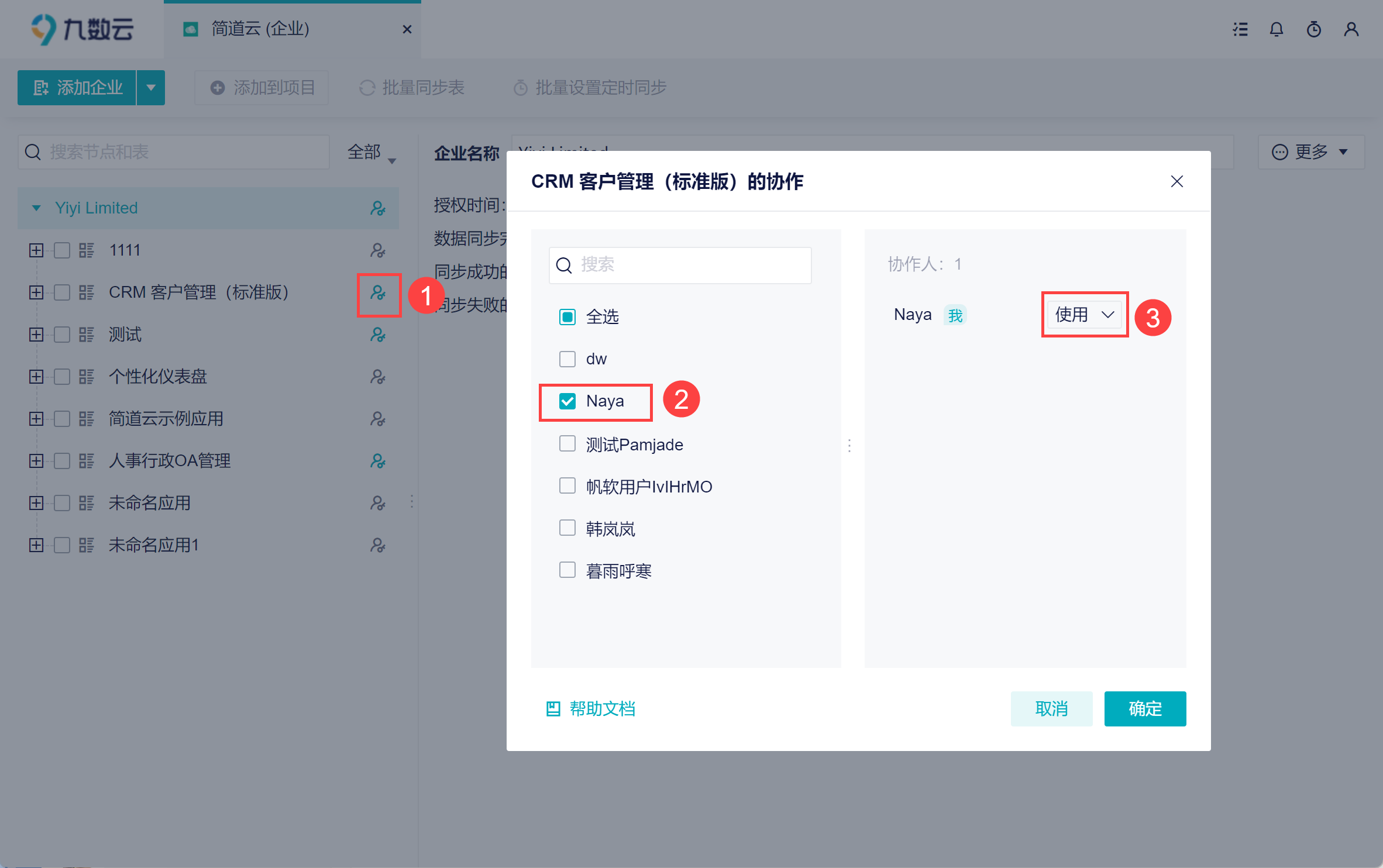 1)在简道云企业数据中,给成员分配某个分组的使用/修改权限。如下图所示: