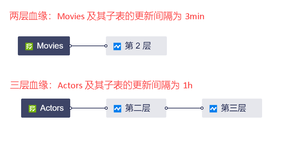 若实时分析表的血缘关系在两层以下,那么实时分析表及其子表的最小更新间隔为 3min;