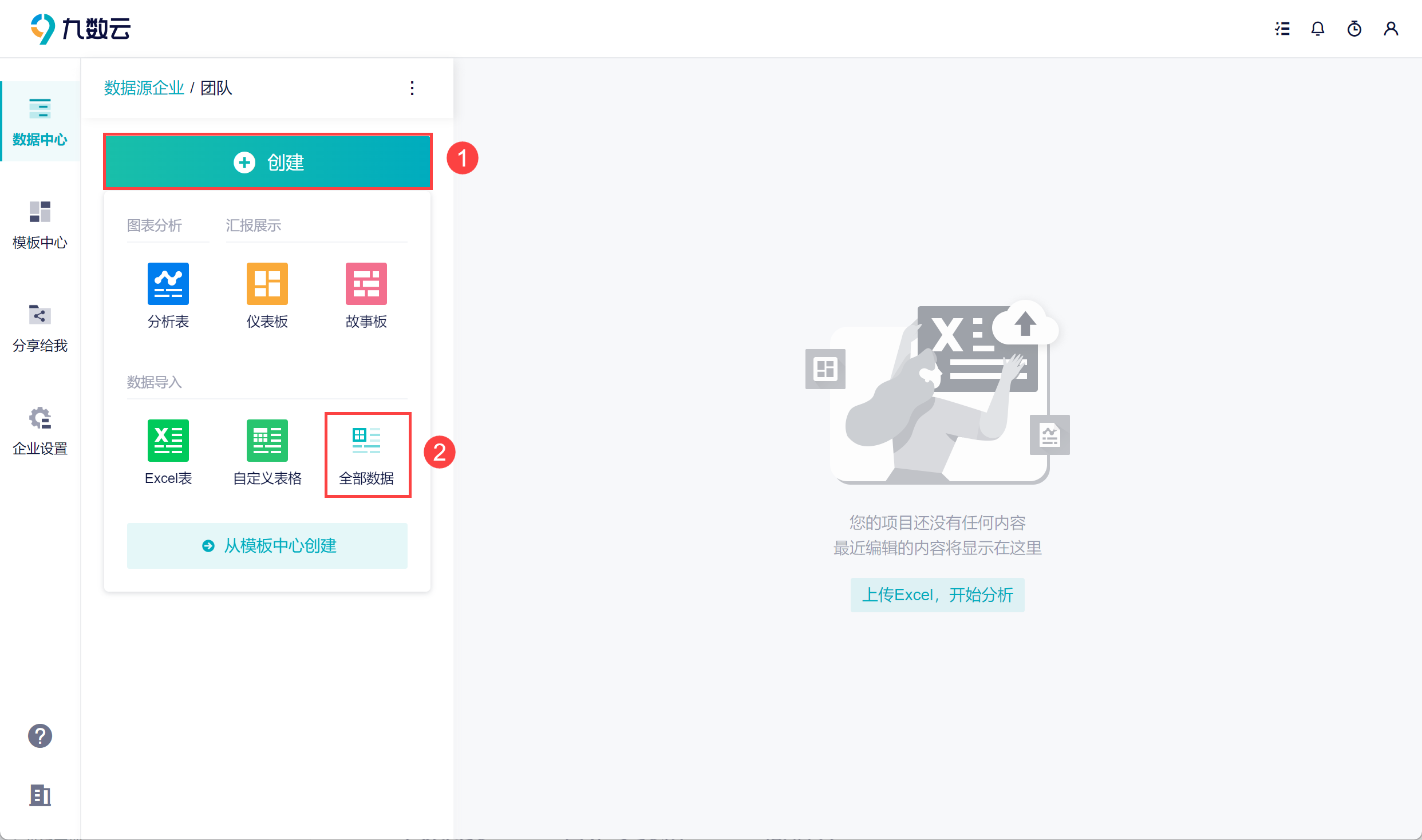 1)选择进入某一个团队,点击「创建>全部数据」进入数据源界面。如下图所示: