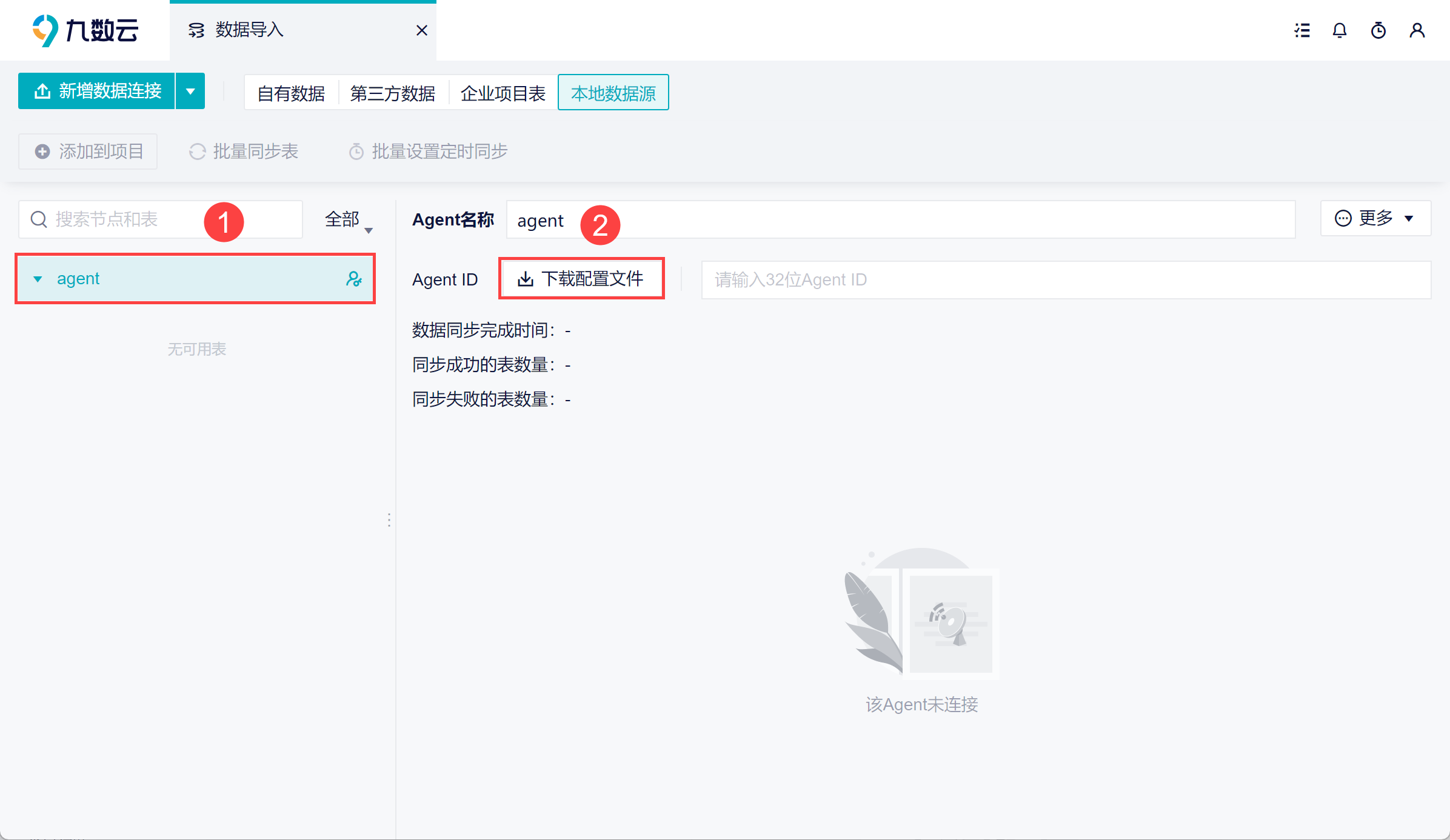 注:请确认数据源标识(agentID)是否与九数云节点的 AgentID 是否一致,不一致的话需要重新导入。