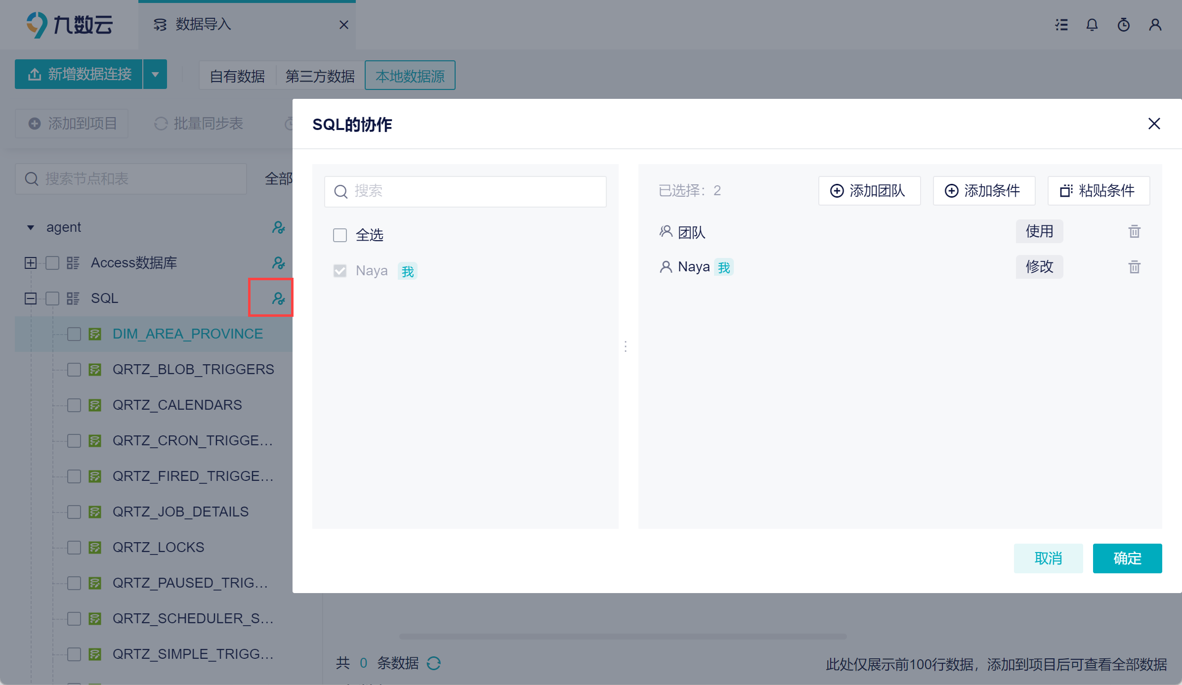 注:这里的位置,是指当前数据源界面所在团队的项目中。比如 A 从 团队 1 中进入数据源界面,这些数据只能添加到团队 1 中的项目中。