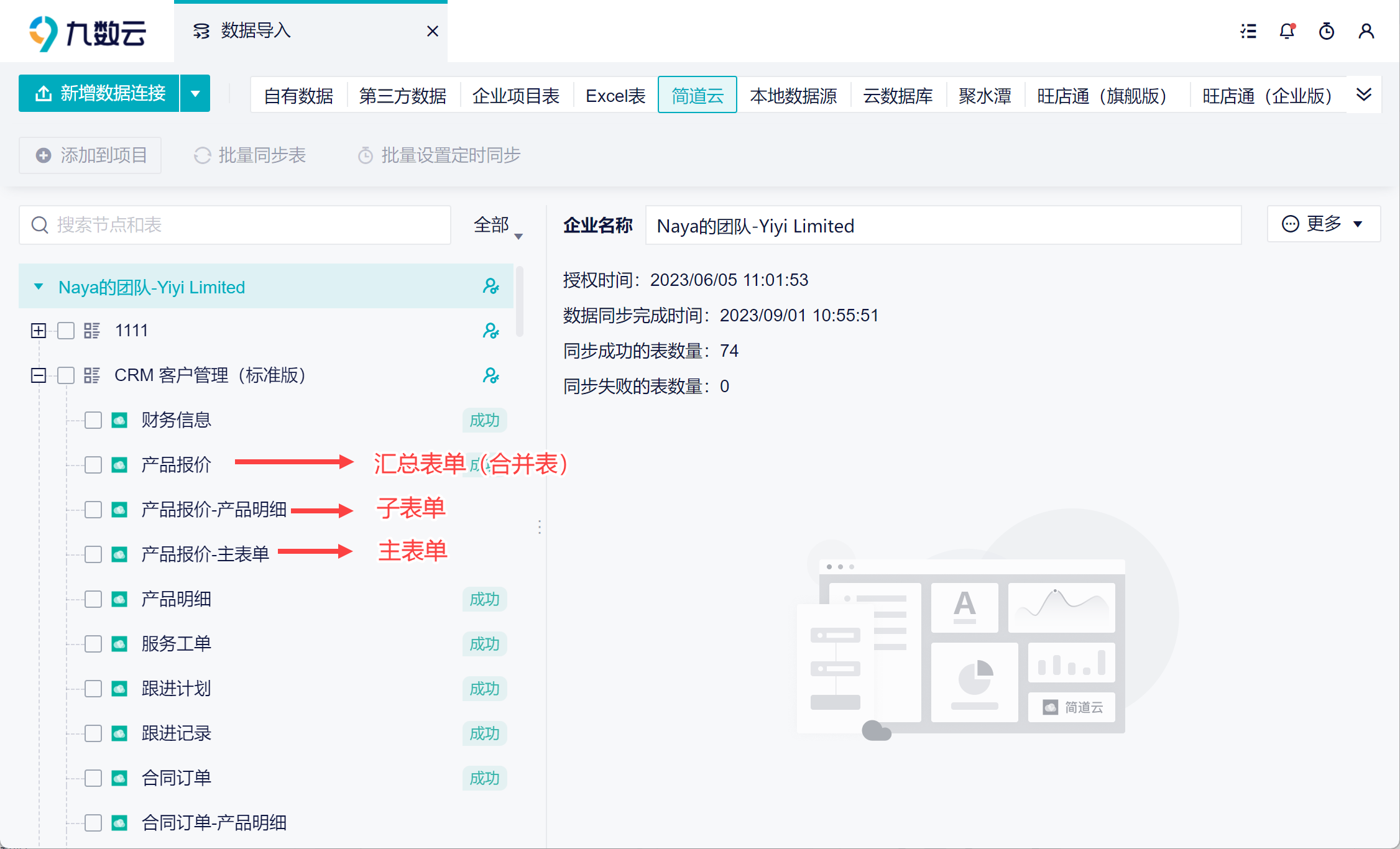 若简道云表单中含有子表单,数据同步至九数云后,保留原表,并自动拆分出主表单和各个子表单,可以按需取用。如下图所示: