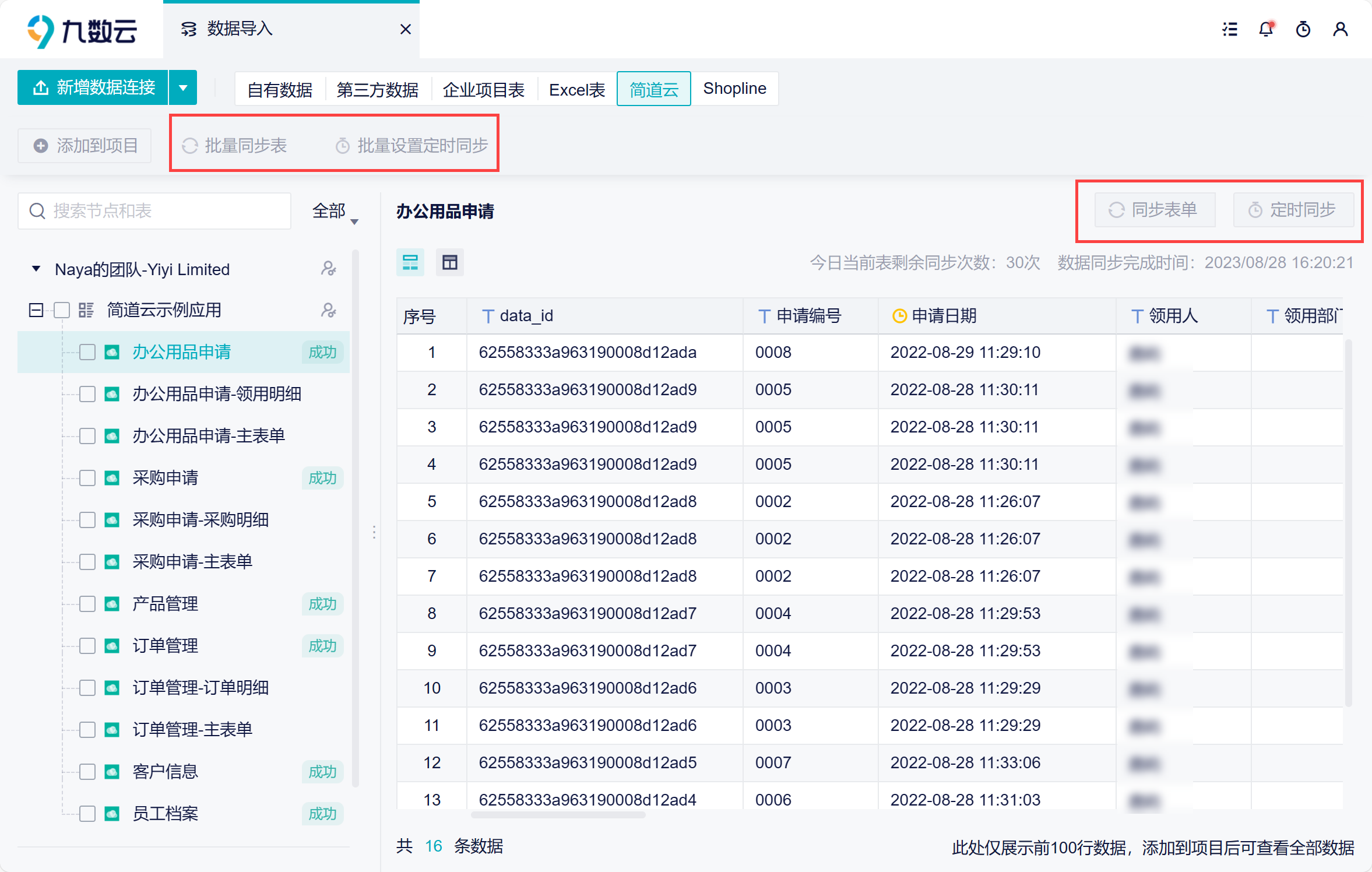 数据同步至九数云后是可以单独拆出子表单数据,可以将子表单数据添加到项目后进行分析。如下图所示: