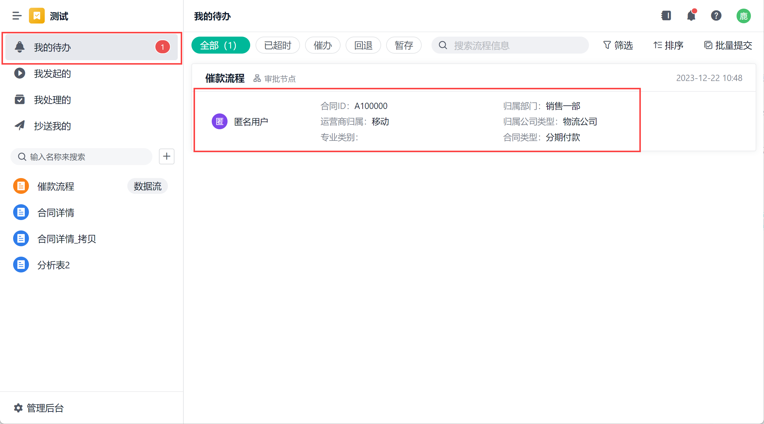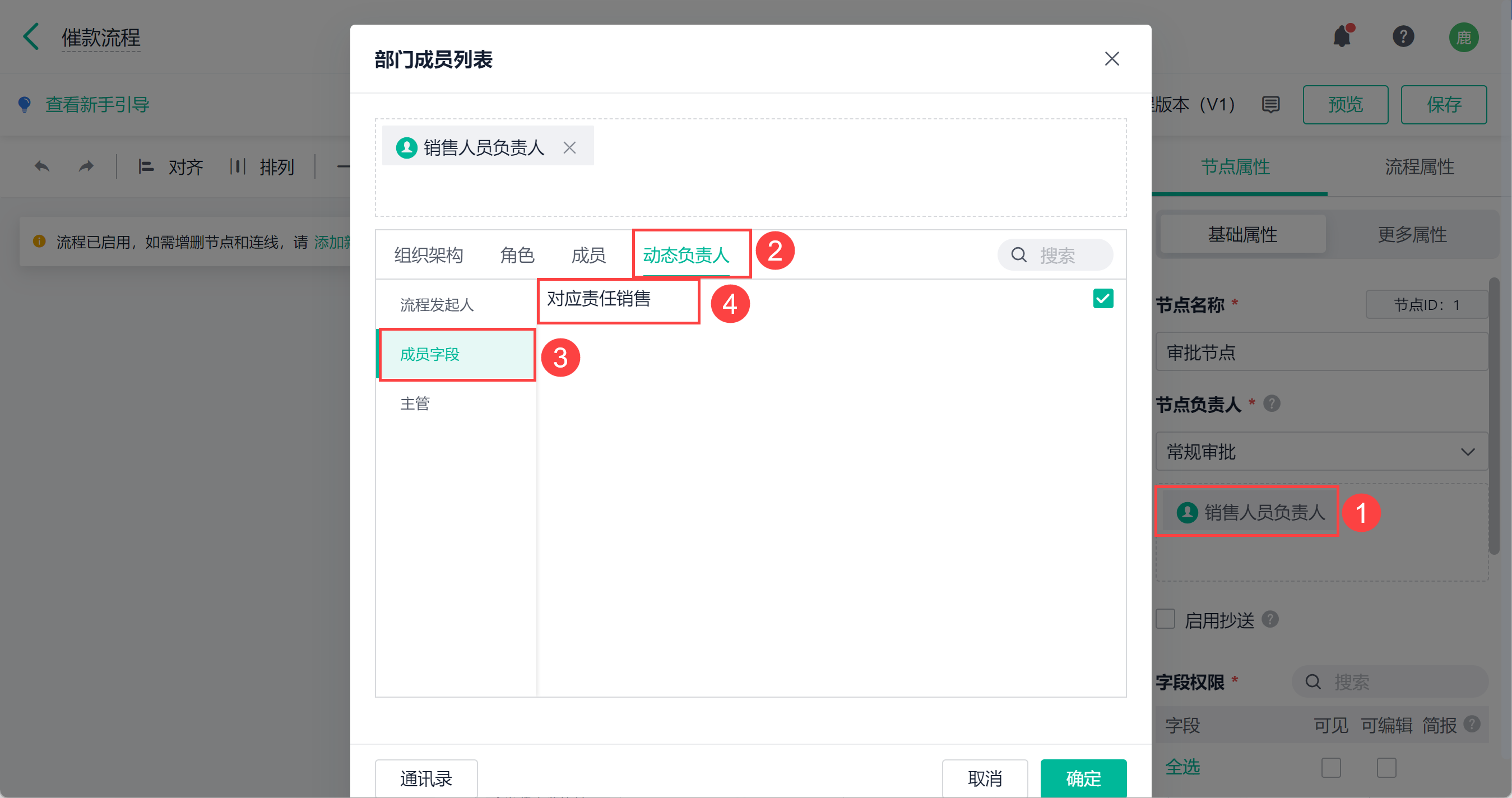 在审批节点,可以将「节点负责人」设置成动态负责人,那么就可以将需要催款的客户数据发送给对应的责任销售。如下图所示: