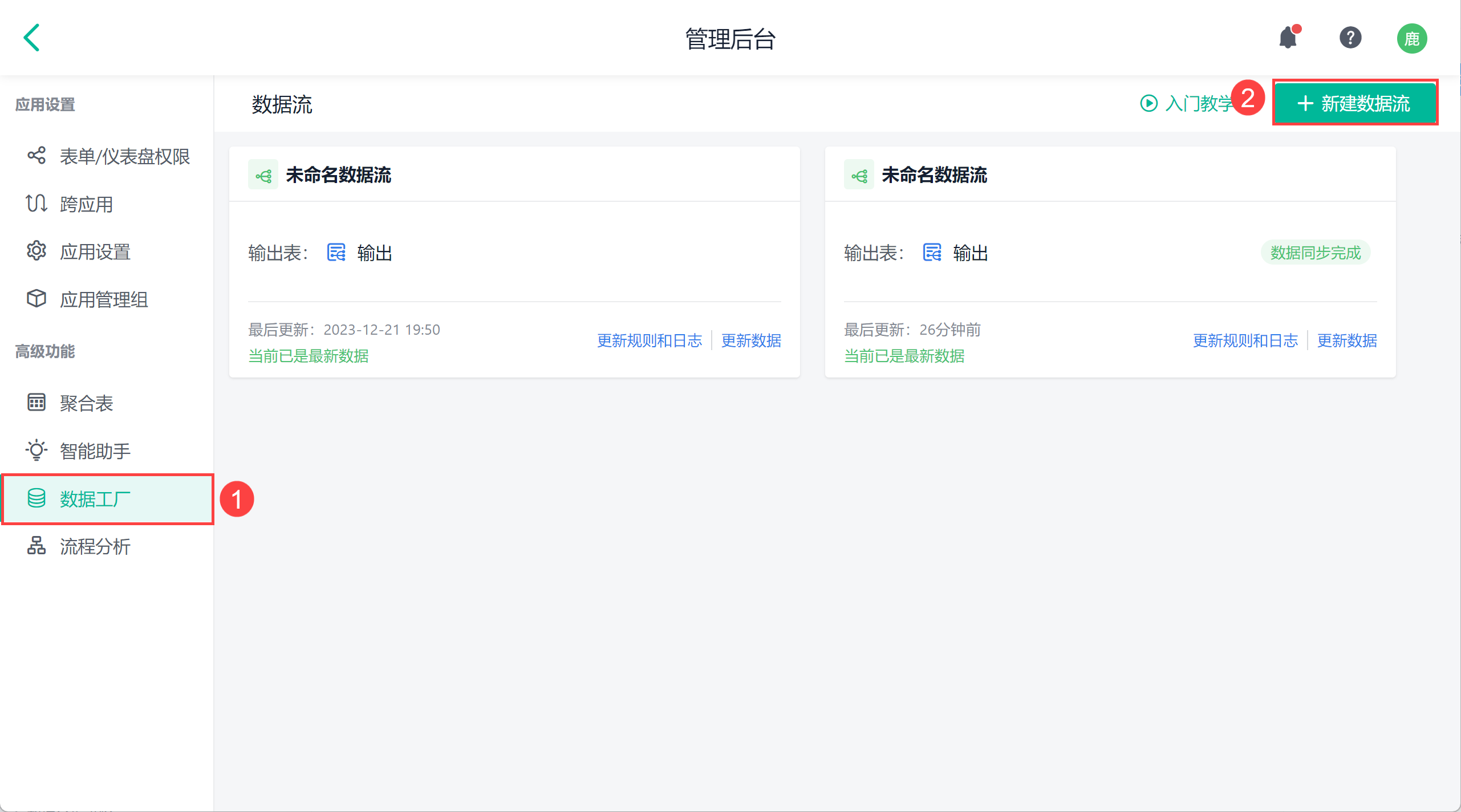 2)在数据工厂中新建数据流,将回填表作为输入表,输出表选择流程表单。