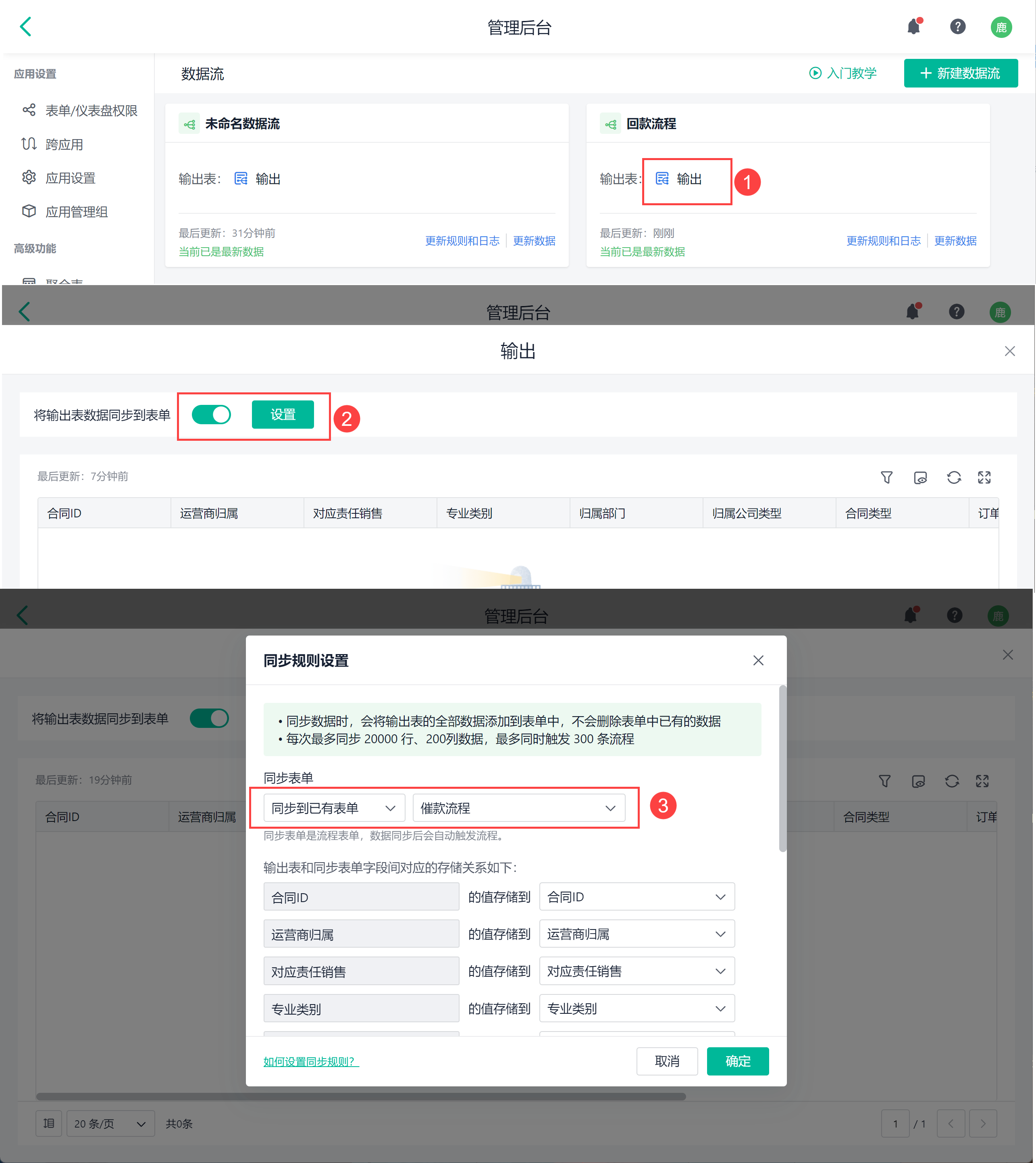 3)设置输出表数据同步到已有的流程表单,也就是前面创建的催款流程。这里还要注意匹配数据表字段和同步表单字段间的对应关系。如下图所示: