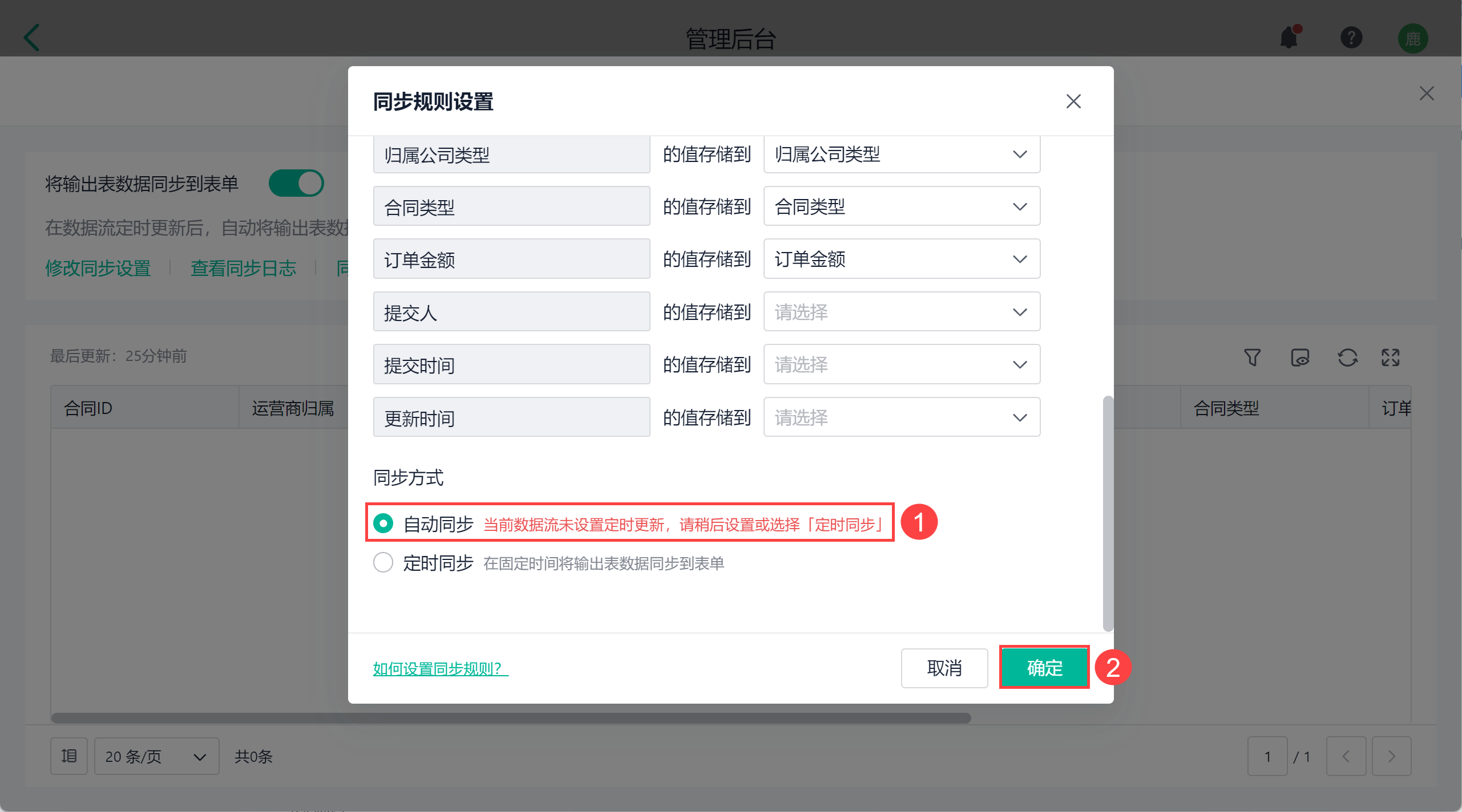 4)这里的同步方式可以设置 自动同步或者定时同步,本示例选择「自动同步」,在数据流定时更新后,自动将输出表数据同步到表单。设置好后,点击「确定」。如下图所示: