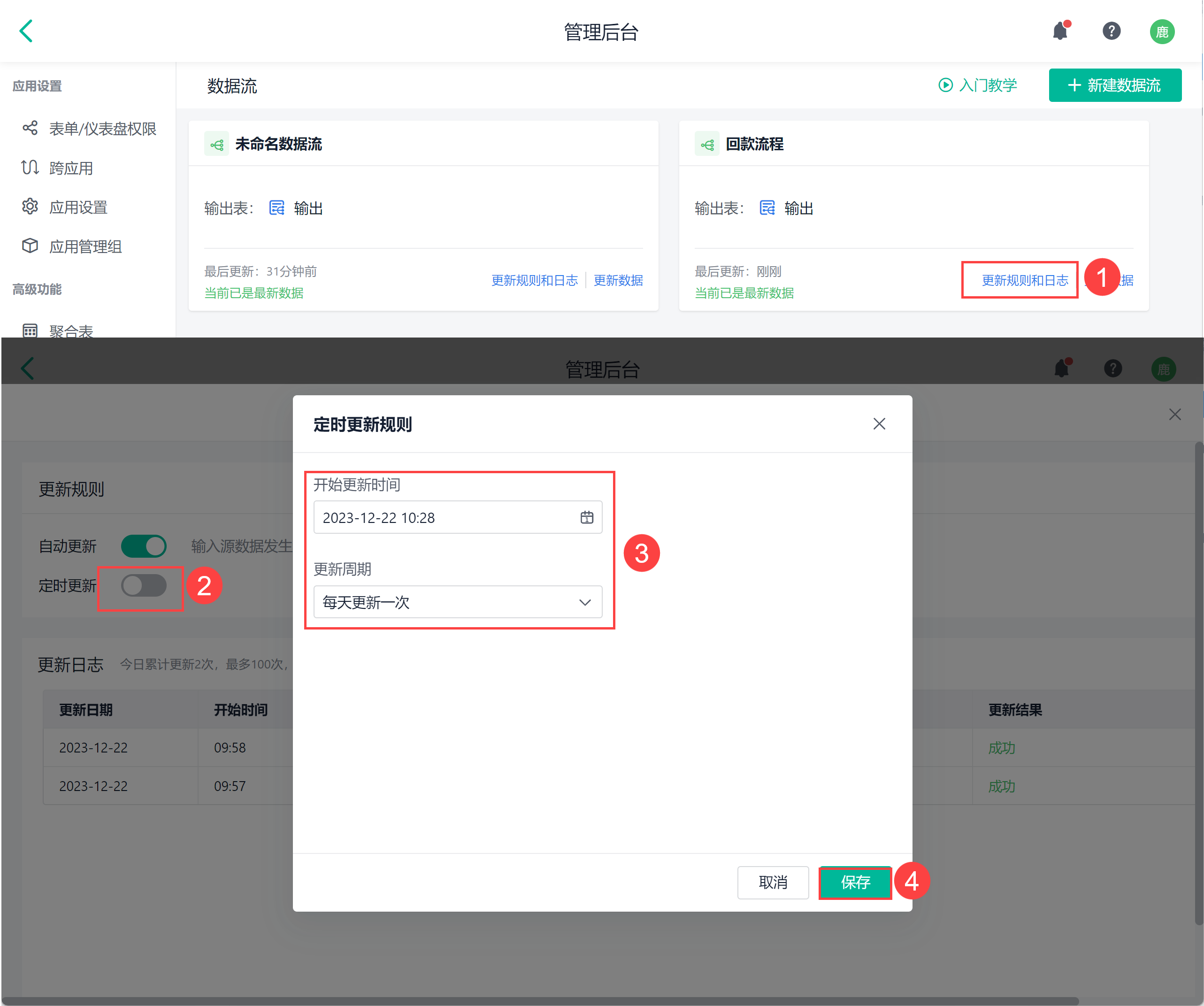 5)如果 4)中设置了自动同步,要对数据流设置定时更新。如下图所示: