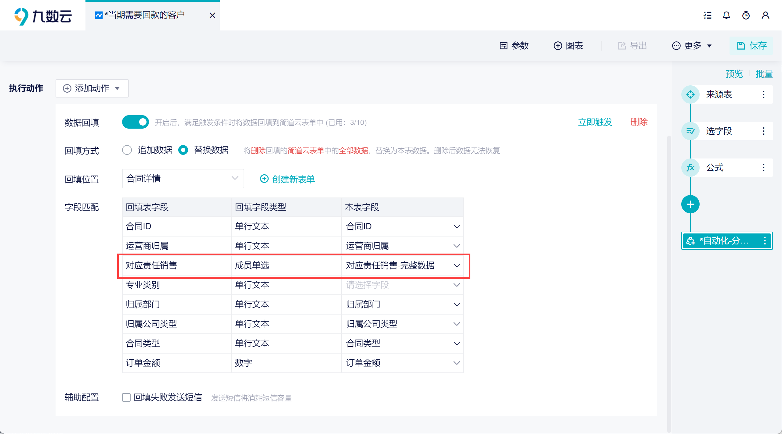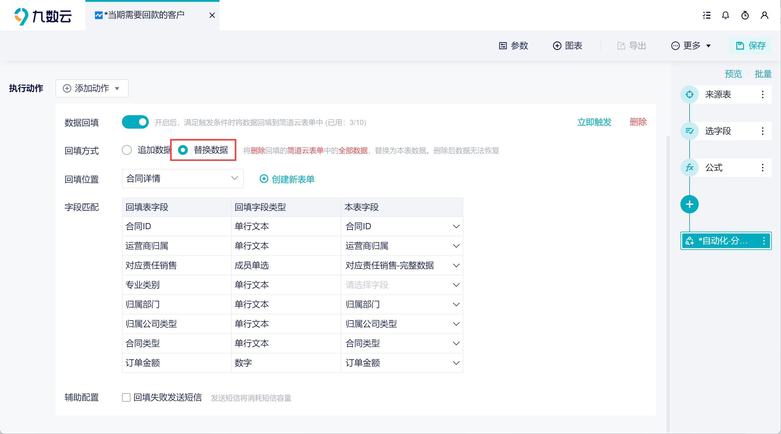 3)在九数云中进行回填配置,回填到简道云中,数据发生更新,即可触发流程。