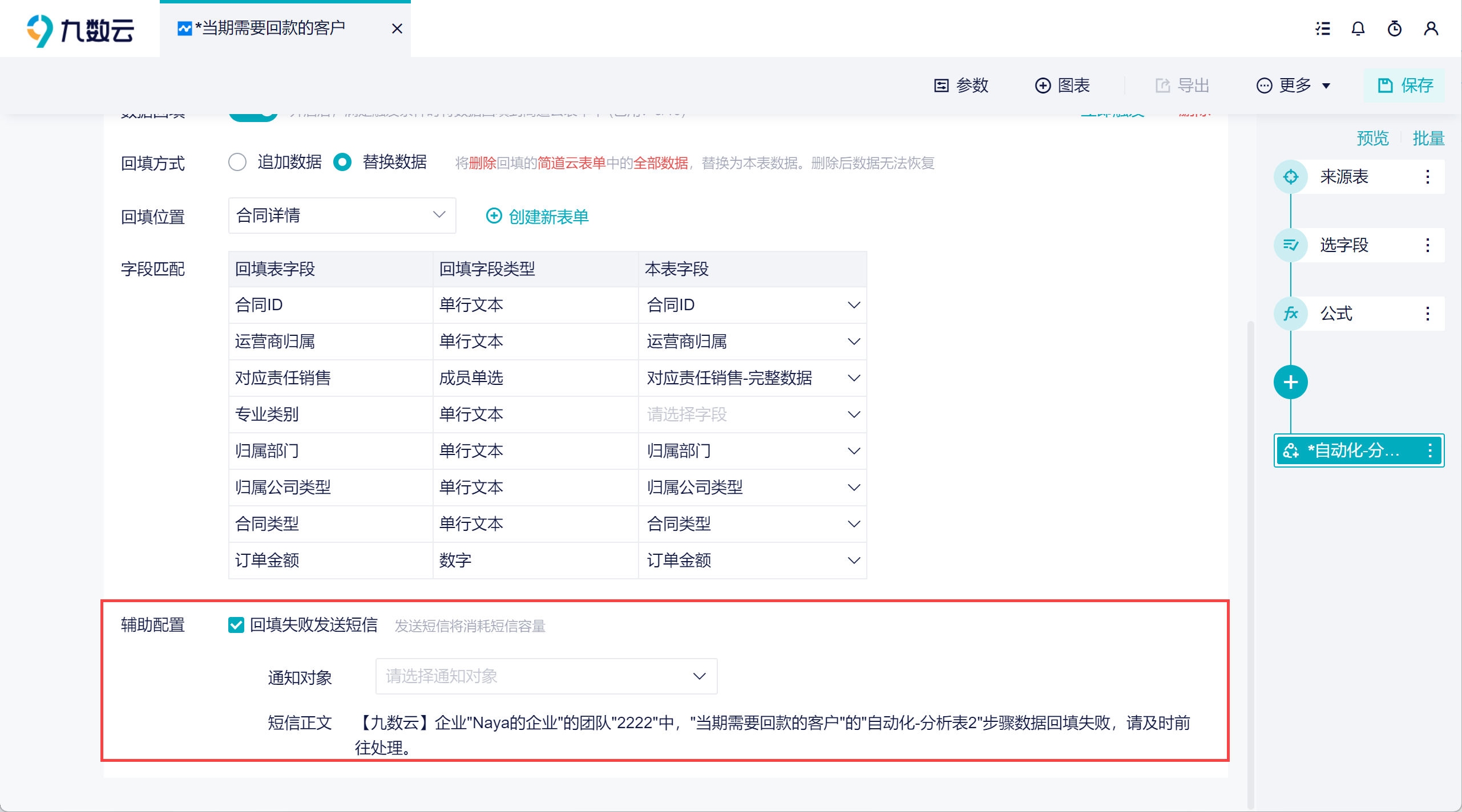 3)如想避免因分析表编辑错误导致回填失败,可以辅助配置通知,第一时间排查。如下图所示: