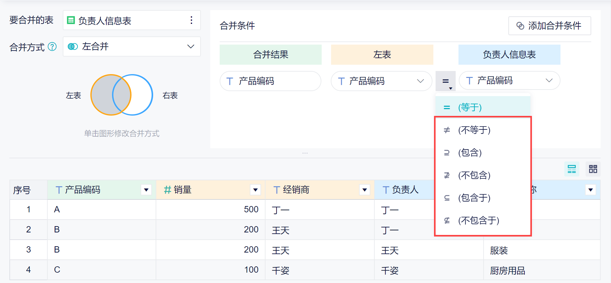 1)左右合并时,除「等于」之外的合并统称为「不等值合并」。如下图所示: