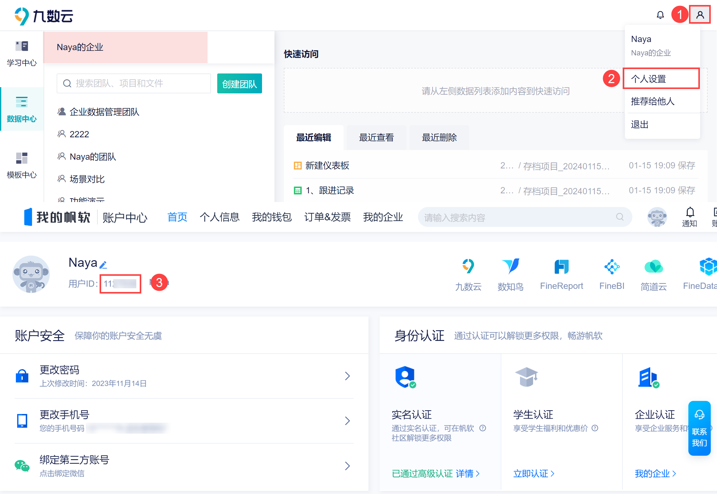 2)在浏览器中,超管使用企微扫码登录九数云,从右上角进入「个人设置」,获取社区 ID;以及迁入的企微企业名称。