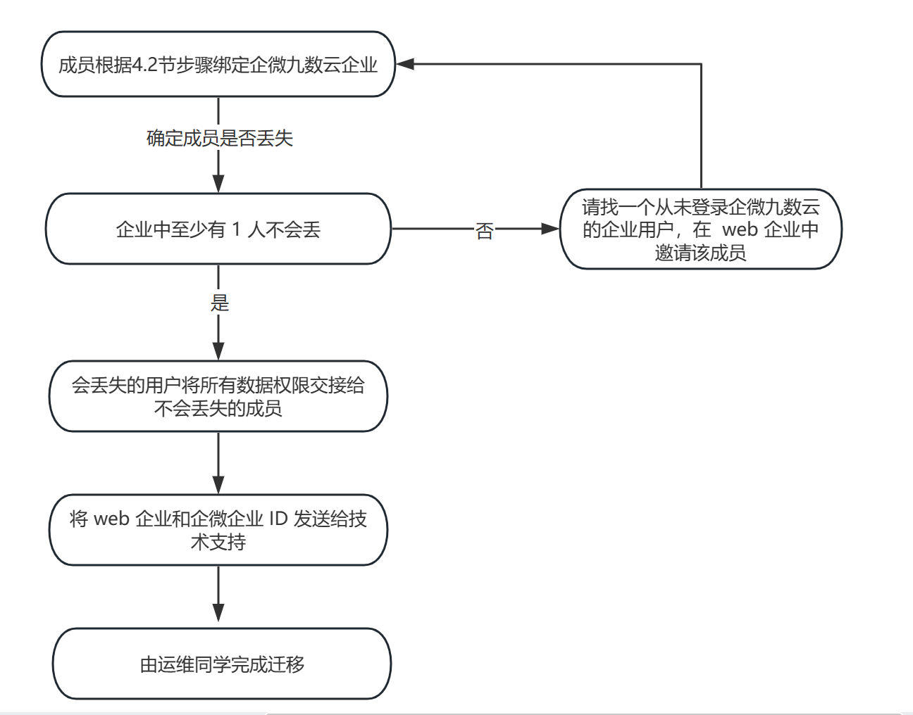 1)提供 web 企业名称、企微九数云企业名称、企微企业 ID 给技术支持,请运维同学进行迁移。