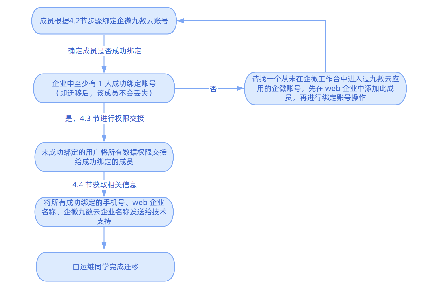 1)将所有成功绑定账号的手机号、web 企业名称、企微九数云企业名称发送给技术支持,请运维同学进行迁移。