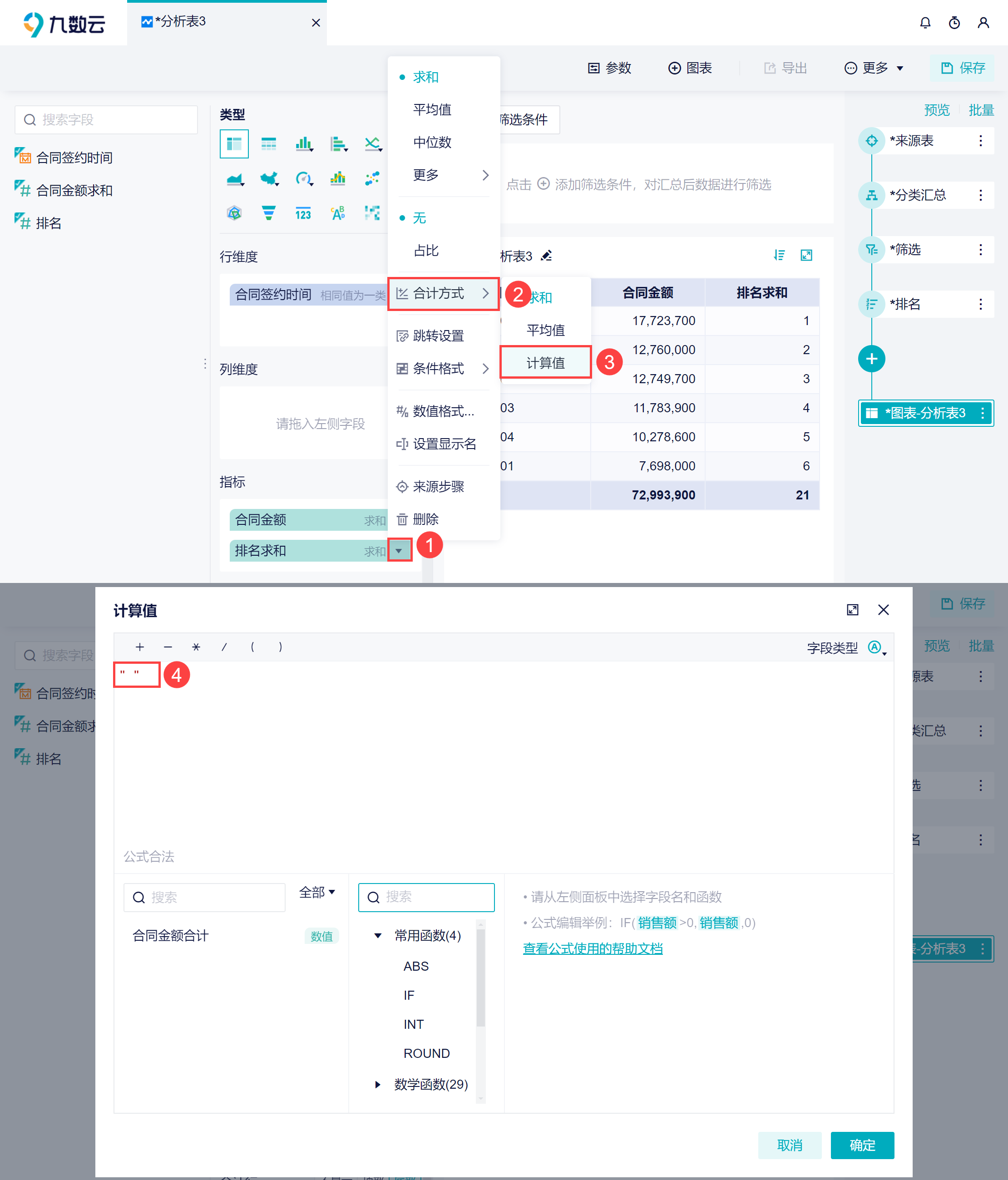 合计方式选择「计算值」时,可以由用户自己配置计算公式,进而满足对汇总值求占比、求同环比等需求。