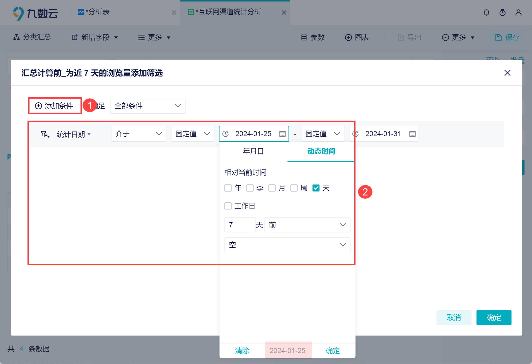 3)添加一个条件,先实现近 7 天的效果。设置「统计日期」介于「动态的 7 天前-动态的 1 天前」。