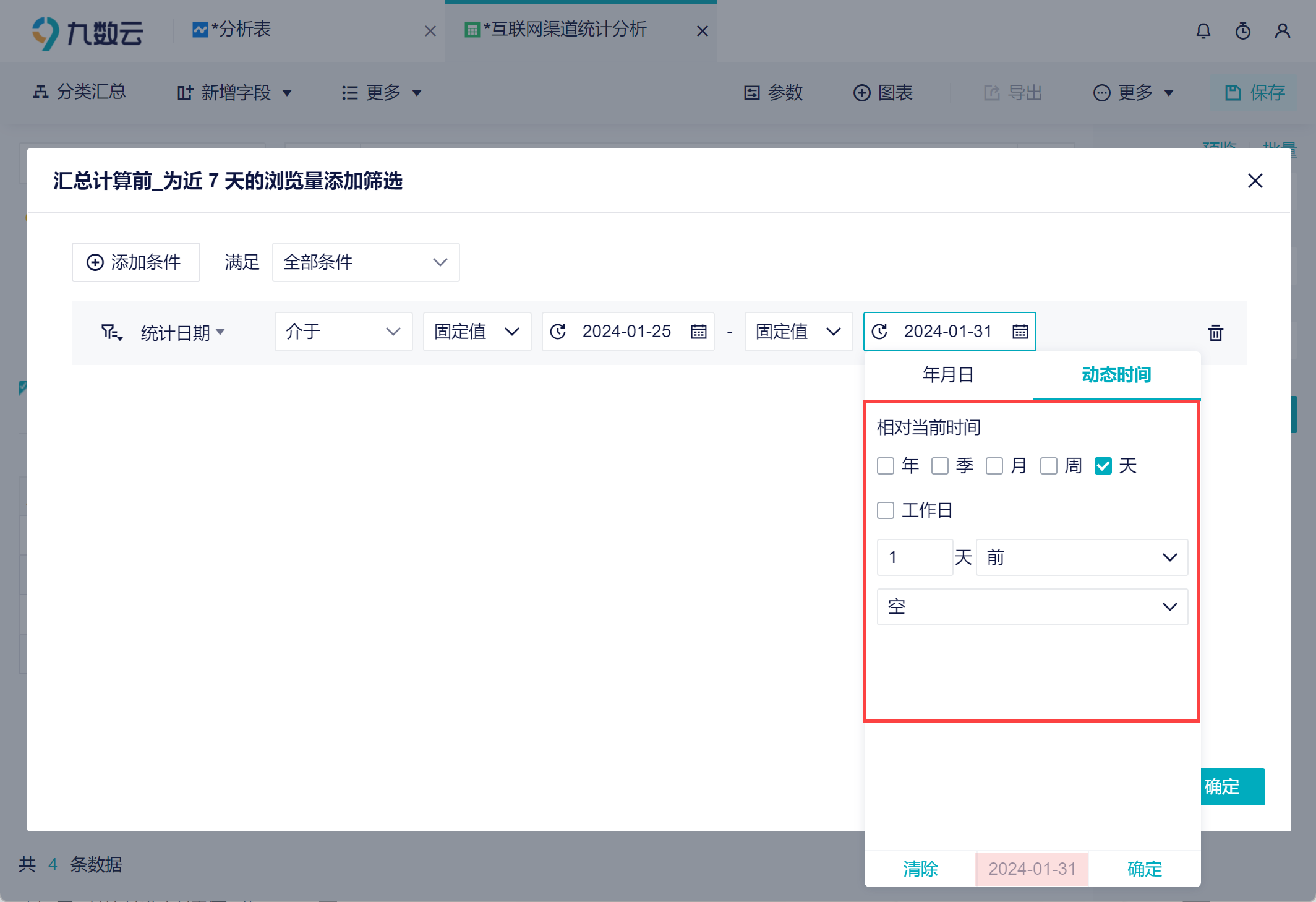 下图为动态的近 7 天前设置,当天是 2024-02-01 ,在下方可以看到 ,7 天前就是 2024-01-25 。