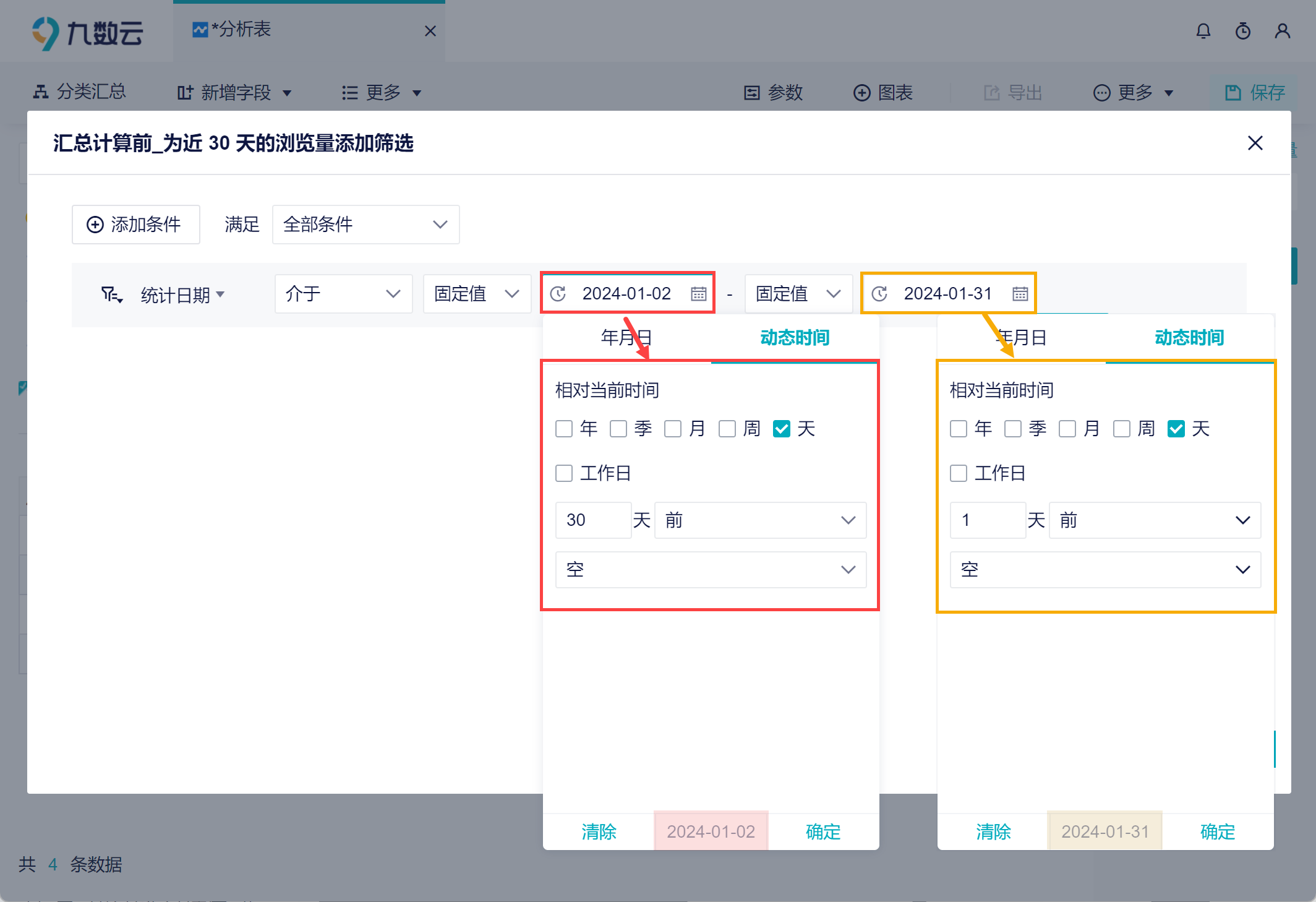 3)同 2.2 节的操作,设置「统计日期」介于「动态的 30 天前-动态的 1 天前」。如下图所示: