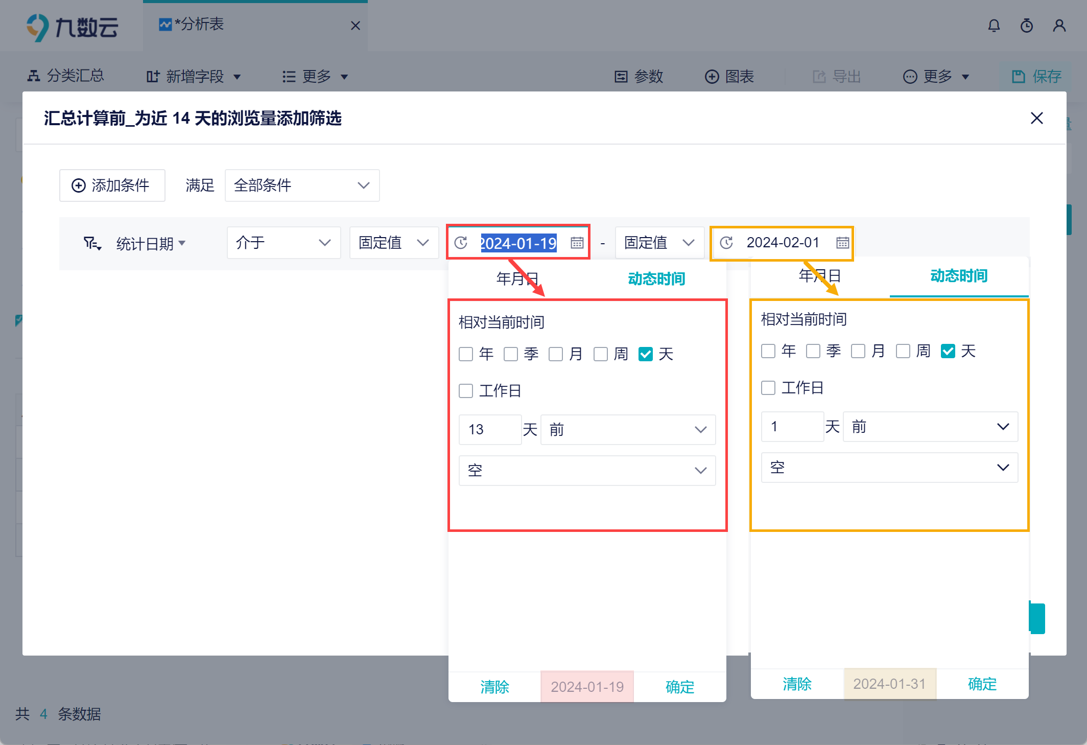 3)同 2.2 节的操作,设置「统计日期」介于「动态的 14 天前-动态的 1 天前」。如下图所示: