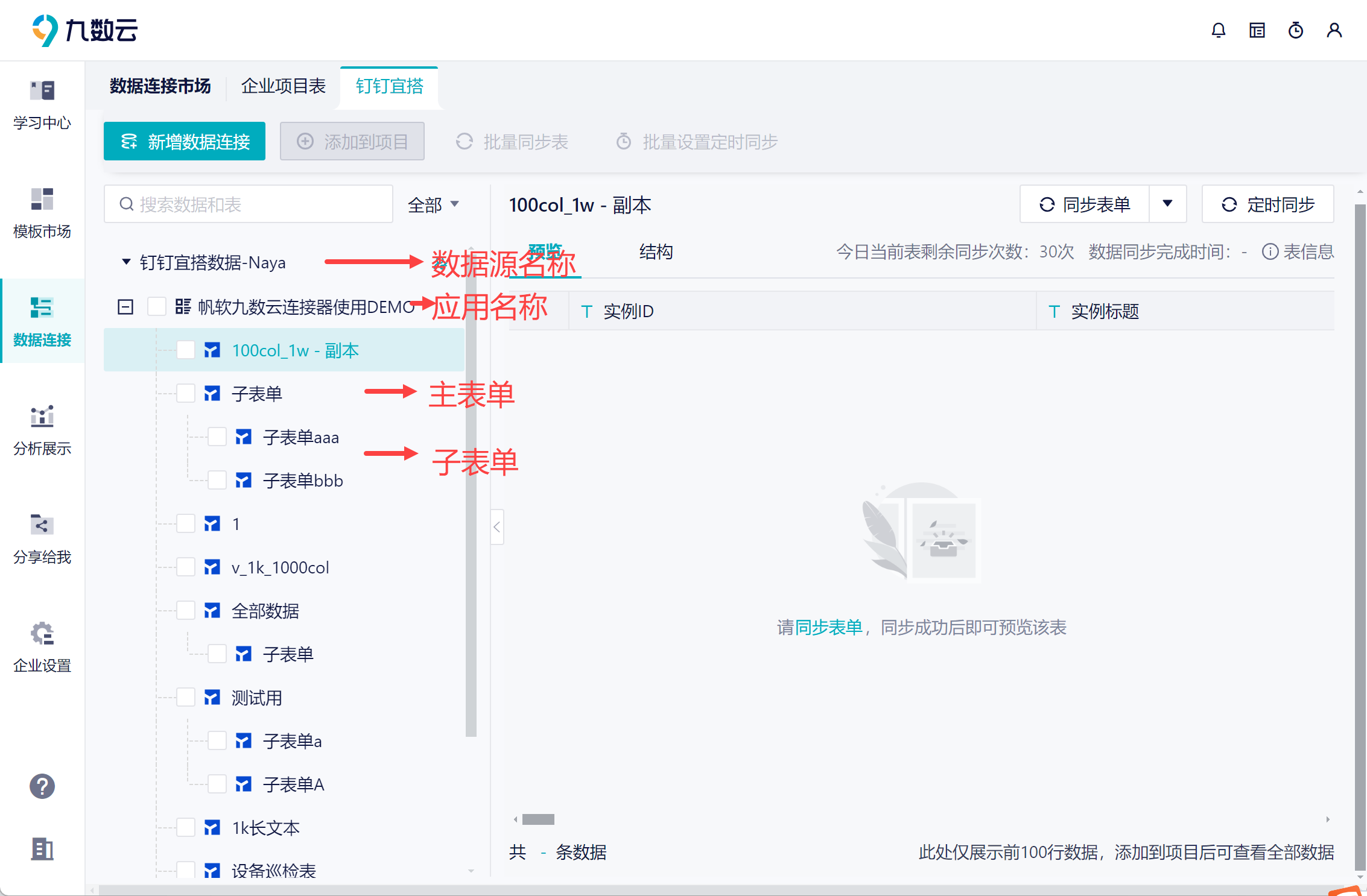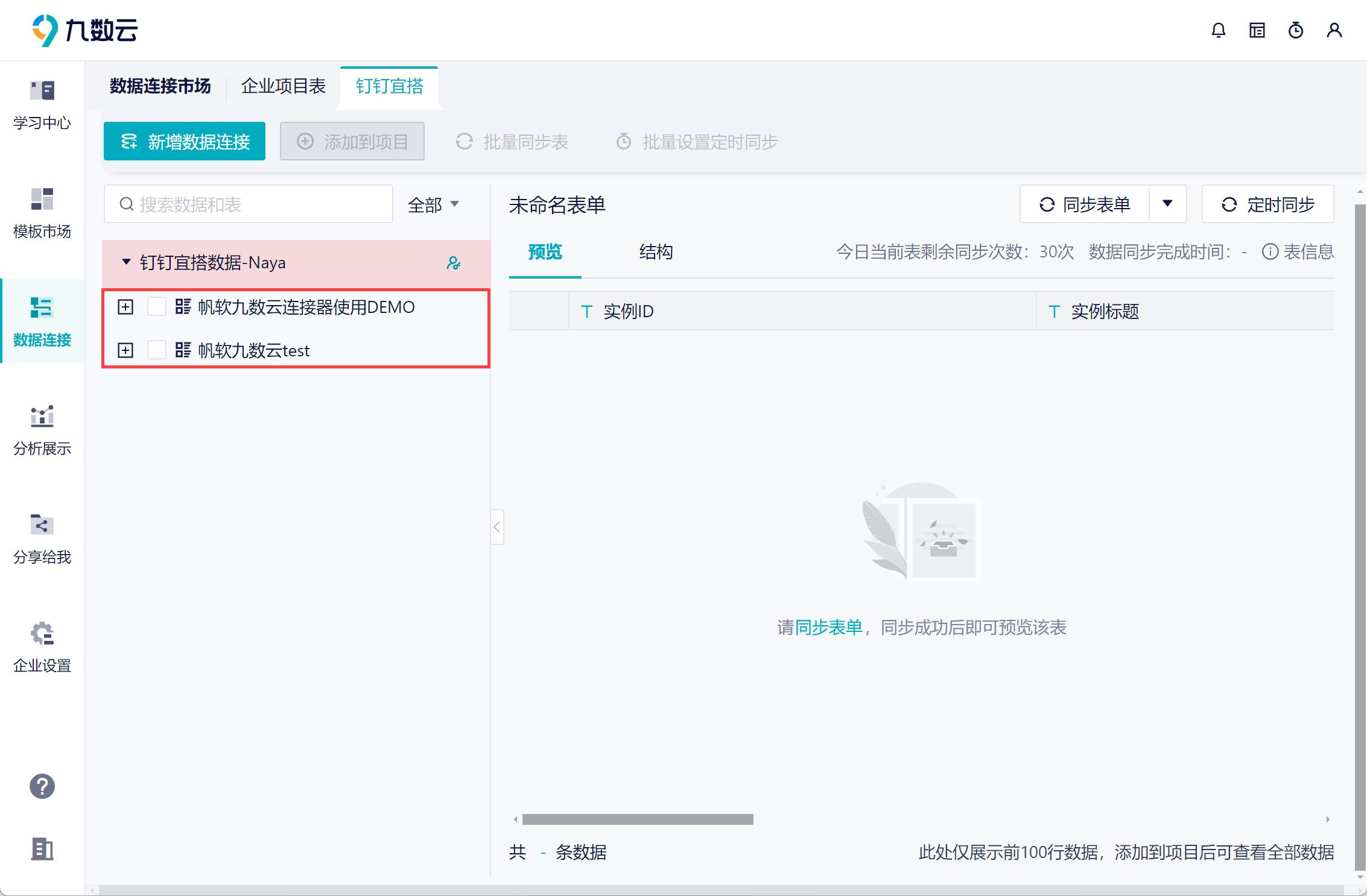 3)填写好信息后,点击「确定」。在左侧就获取到了数据列表,将该应用中的数据列表获取至九数云了。如下图所示: