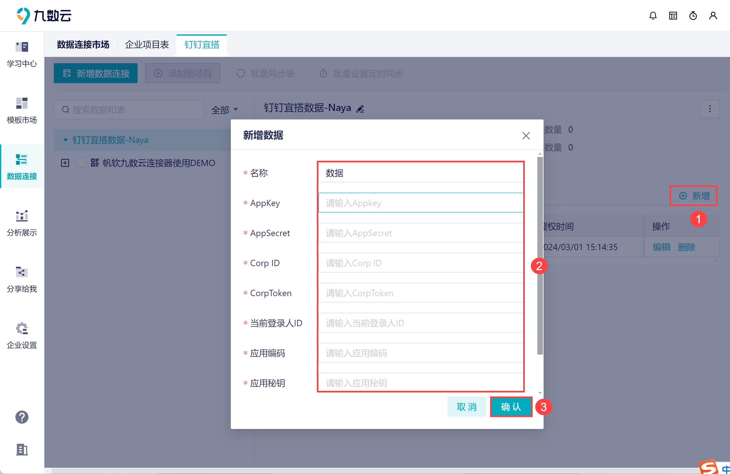 4)回到九数云中,新增「钉钉宜搭」数据源,并填写相关信息,即可完成授权,将钉钉宜搭数据同步到九数云中。