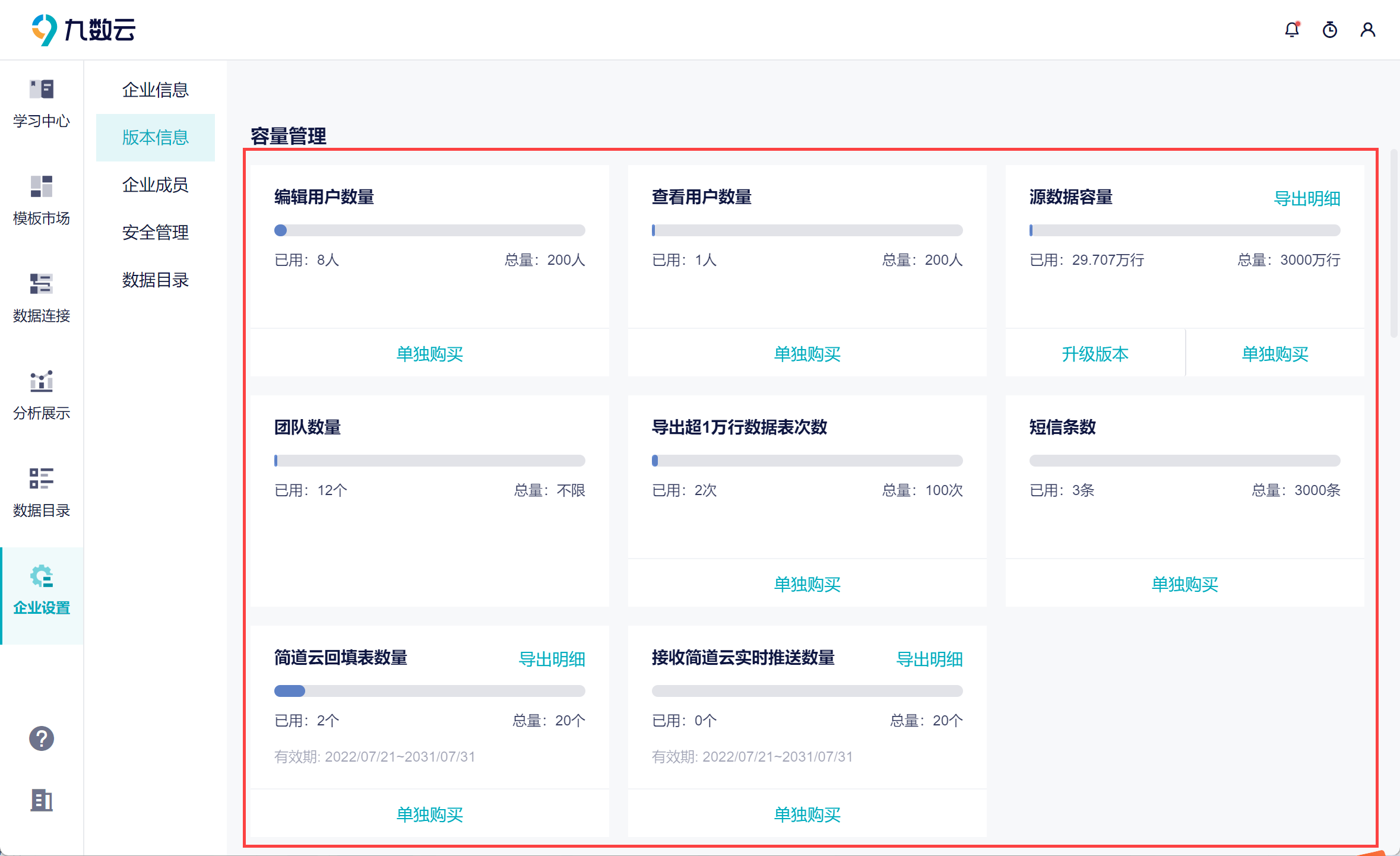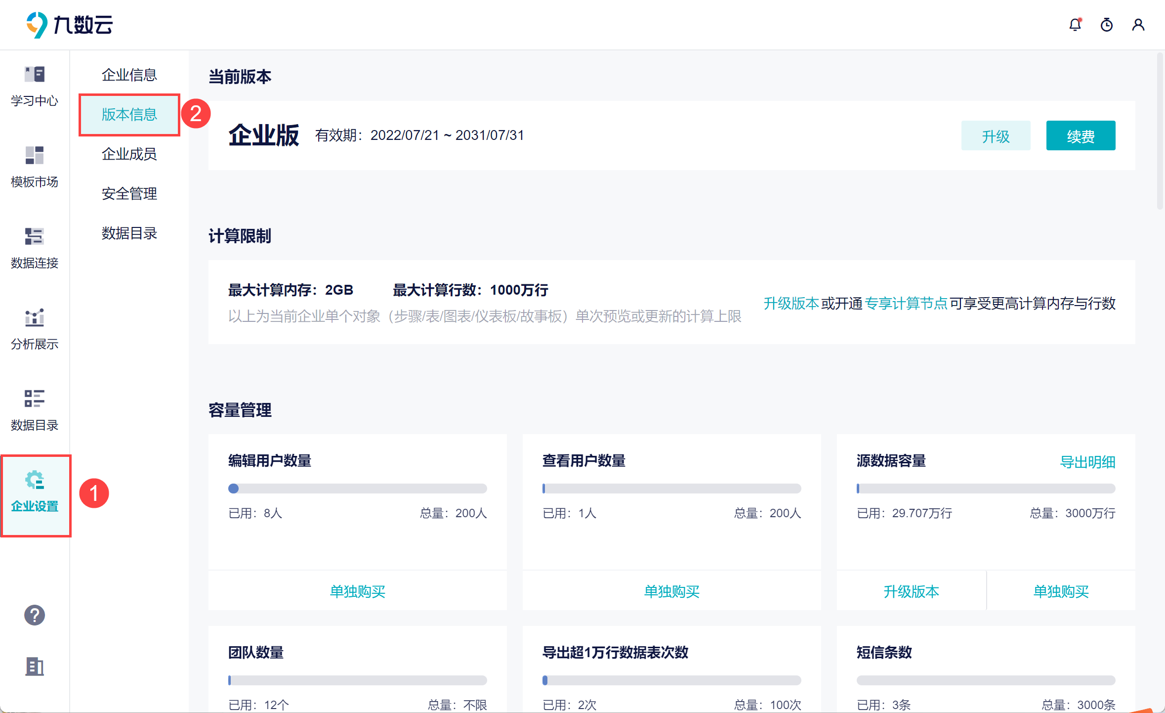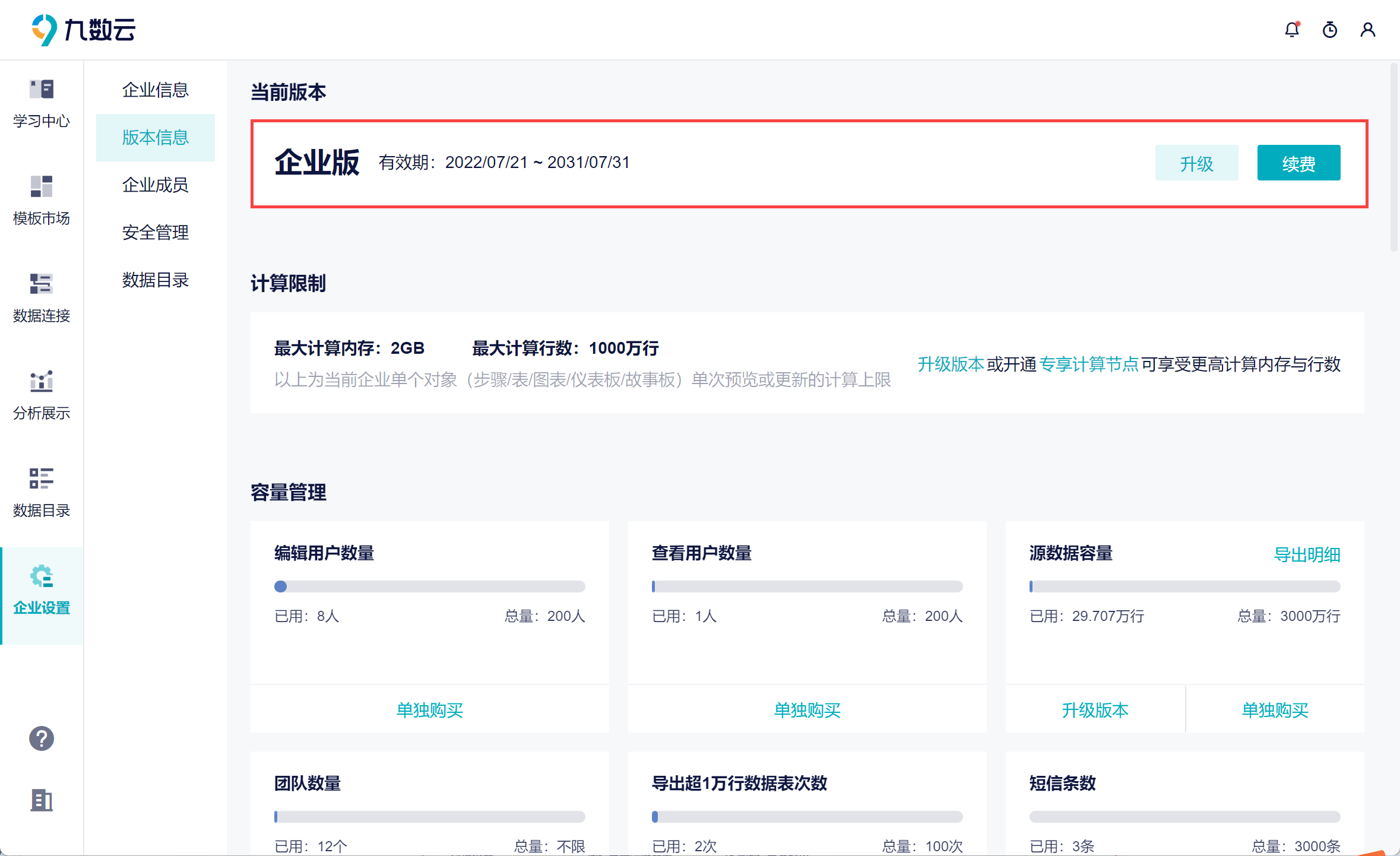 用户想要对当前的企业进行版本升级、续费等操作。或者查看当前企业已占用的资源,比如编辑用户数量、数据导出次数等。