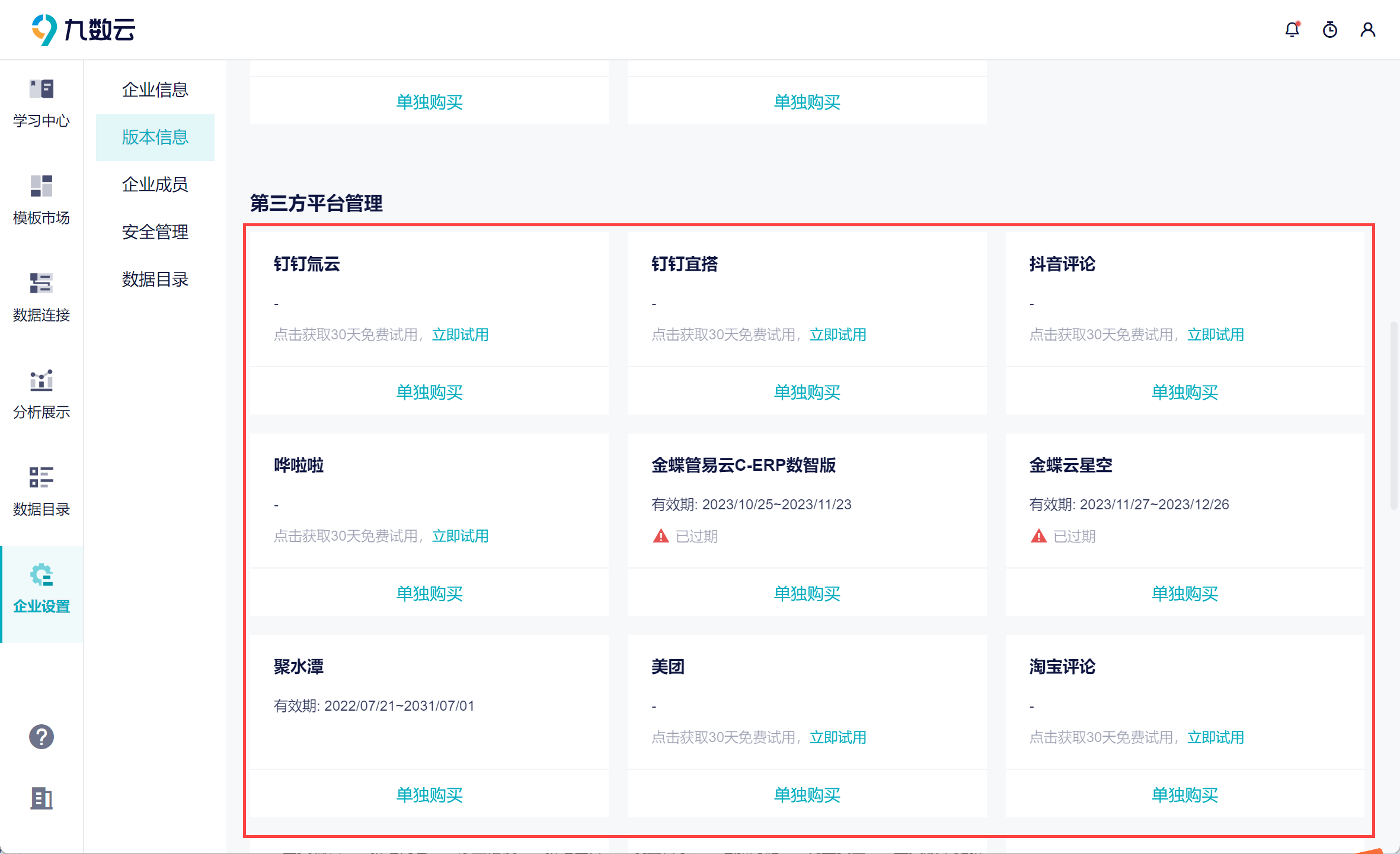 如需在九数云中使用第三方数据源,可在「第三方平台管理」中试用或者购买数据源。如下图所示: