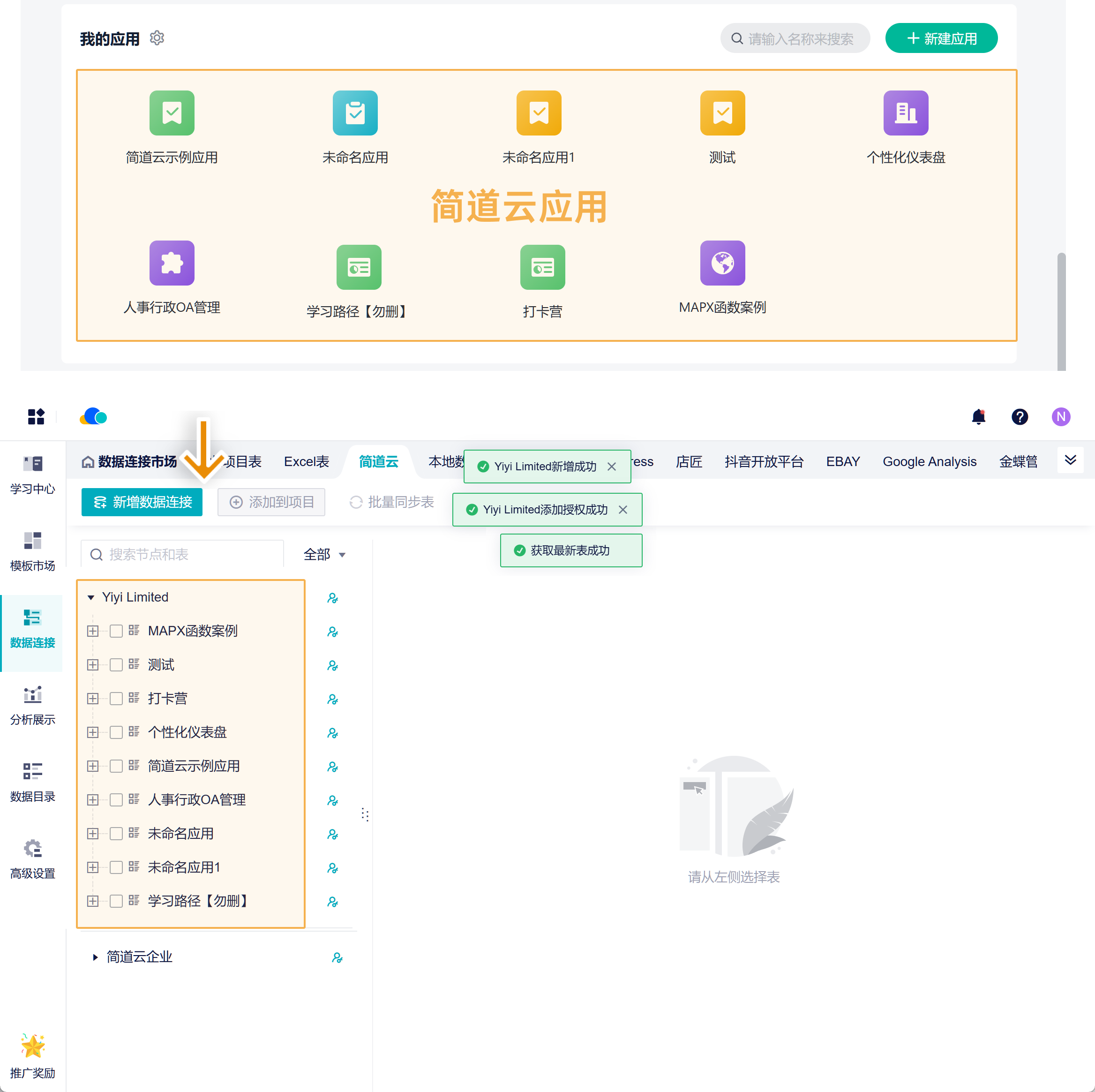 1)请管理员 N 根据 导入简道云数据的 2、3 节 ,完成授权流程,将简道云数据获取到本产品中。如下图所示: