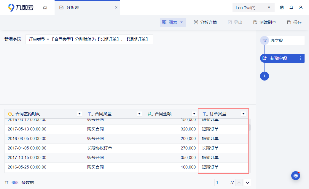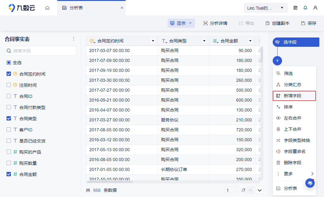 1)下载示例数据:合同事实表.xlsx,并上传到九数云。然后添加分析表。详情参考文档:数据分析流程