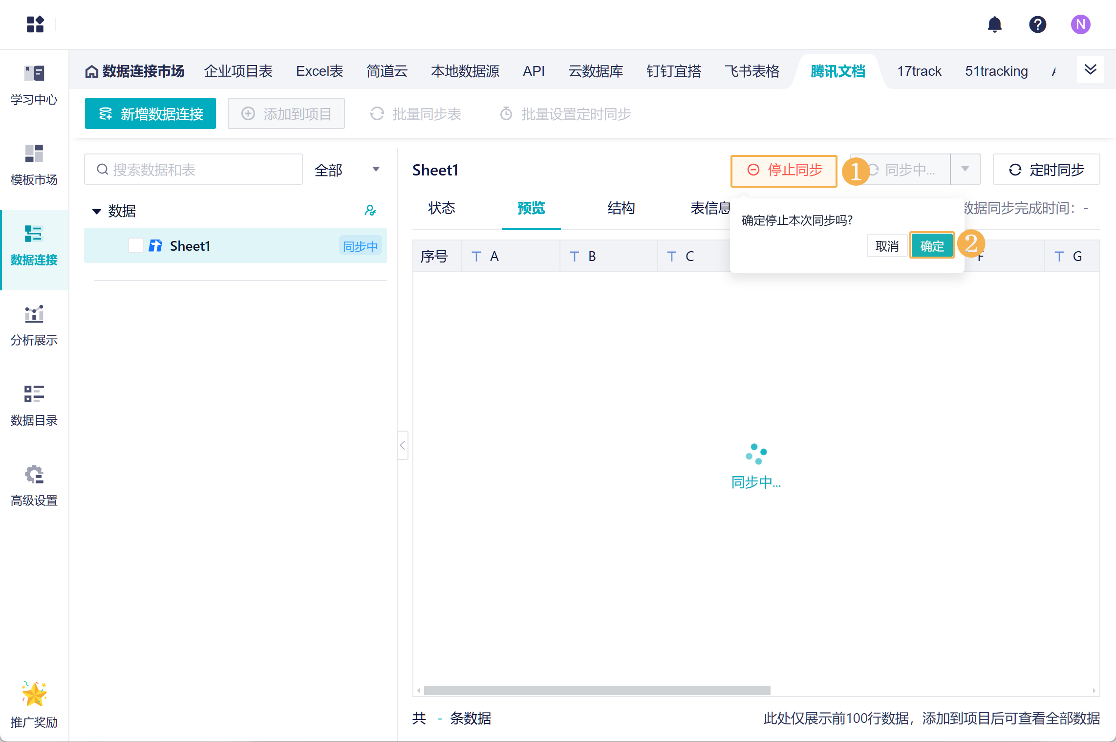 1)若表正在同步中,支持点击「停止同步」按钮,停止本次同步。停止后,表中将增加已经同步获取到的数据。如下图所示: