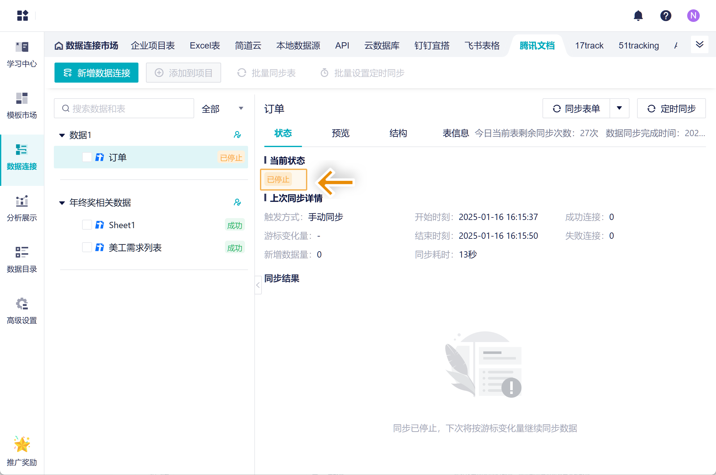 2)停止同步后,当前状态变为「已停止」。如下图所示: