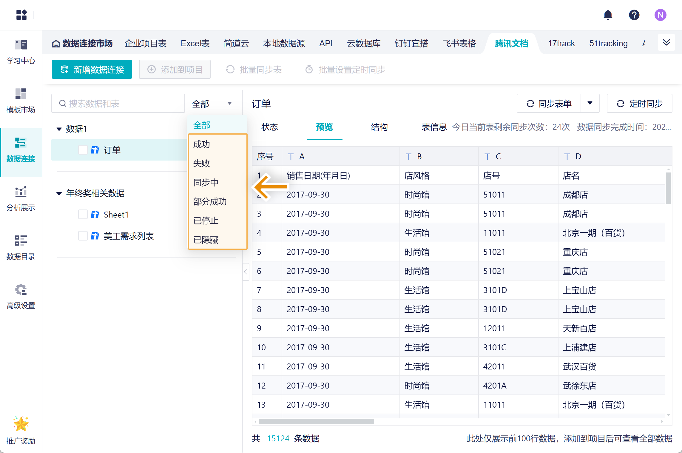 3)若数据表较多,支持筛选出某一种状态的数据表,例如筛选出同步「失败」的数据表。如下图所示: