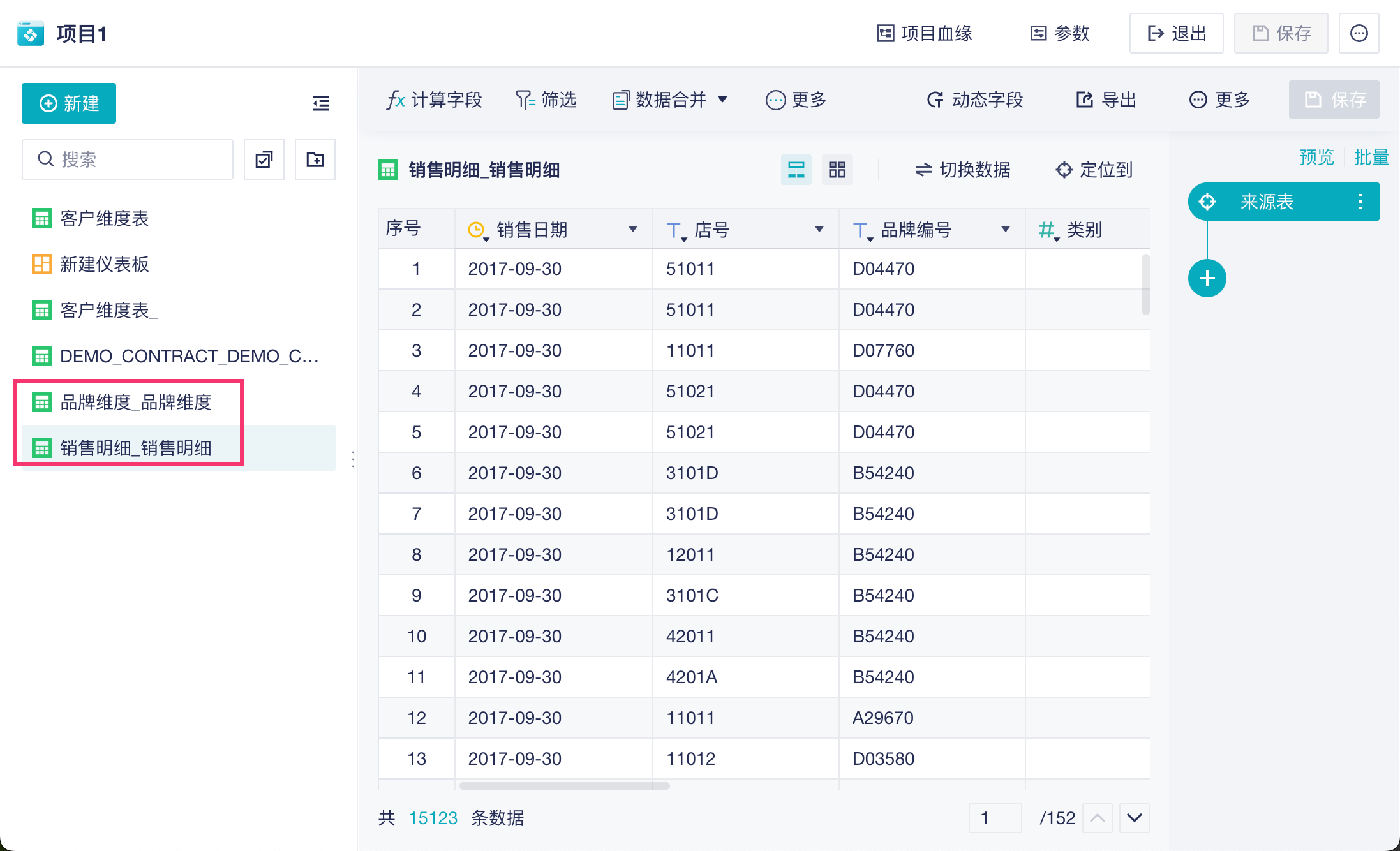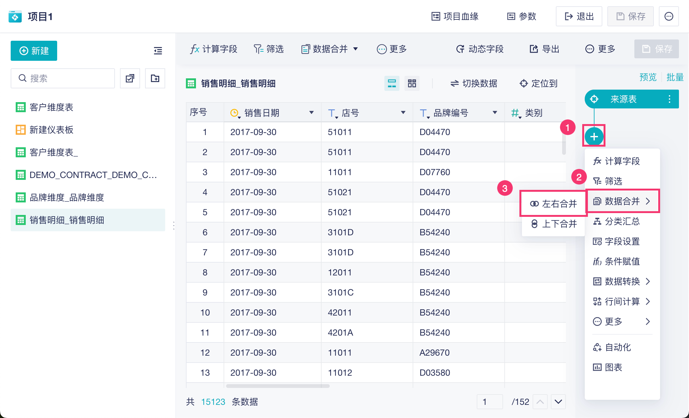 1)下载示例数据并上传至本产品中,将数据保存项目中,选择「销售明细」作为左表,创建分析表进行合并操作,如下图所示: