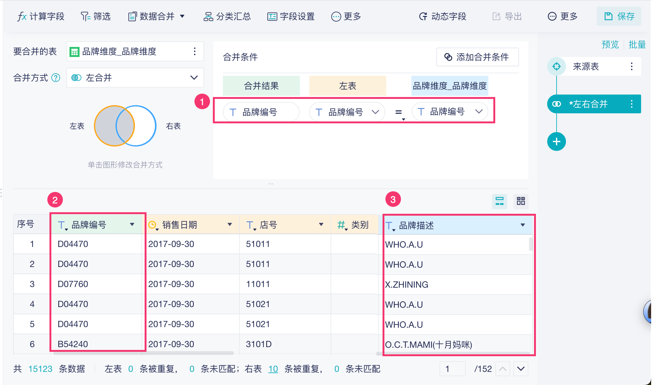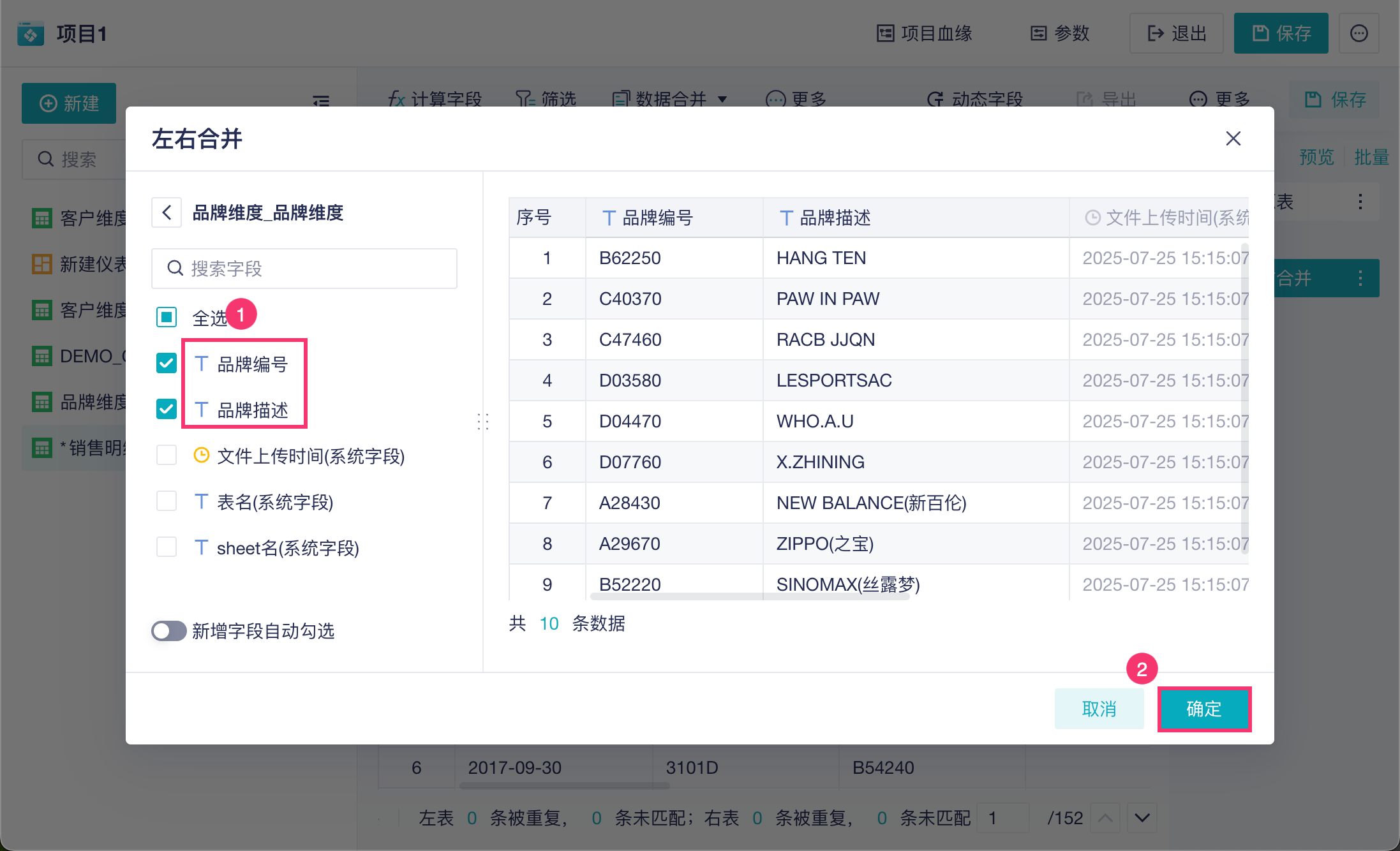 4)如果两个表中有相同的字段,那么系统会自动的进行匹配。比如示例数据中依据「品牌编号」,匹配到了「品牌描述」字段。如下图所示: