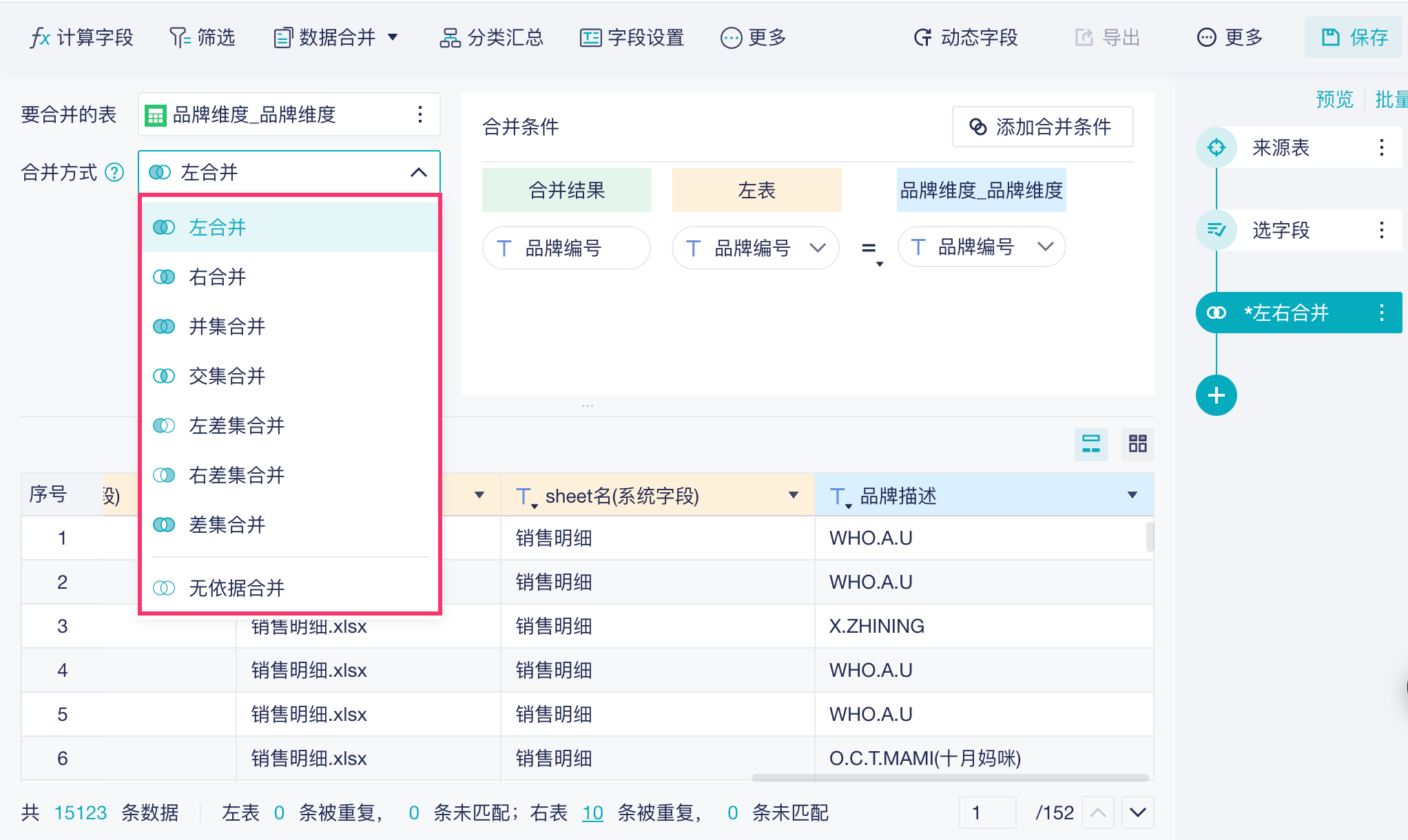 1)本产品有多种合并方式,第 2 节示例展示的左合并。还支持右合并、并集合并等合并方式,在左上角可以进行切换。如下图所示: