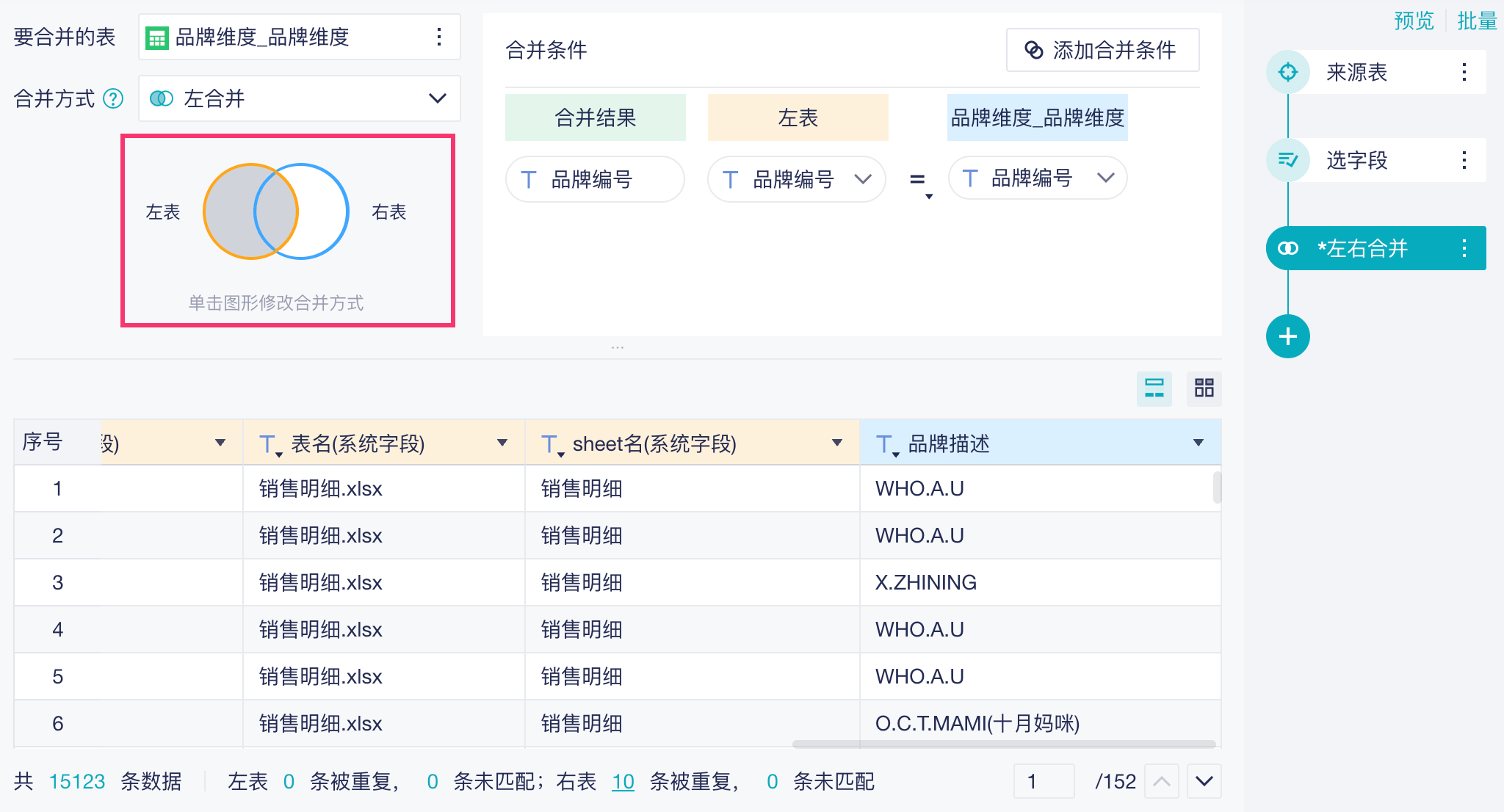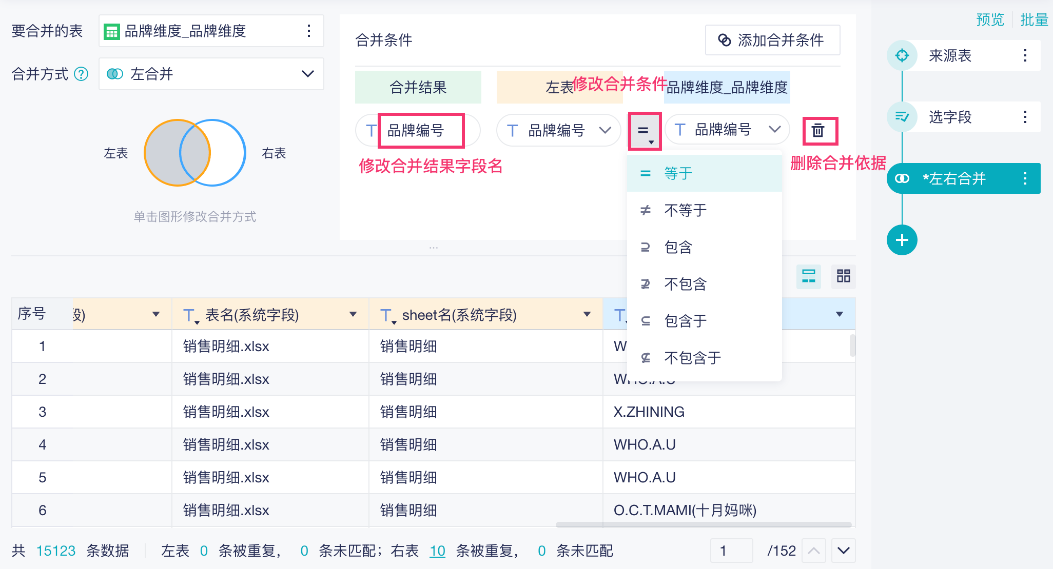 此外,还可以修改合并条件,详情参见参见文档:按条件左右合并