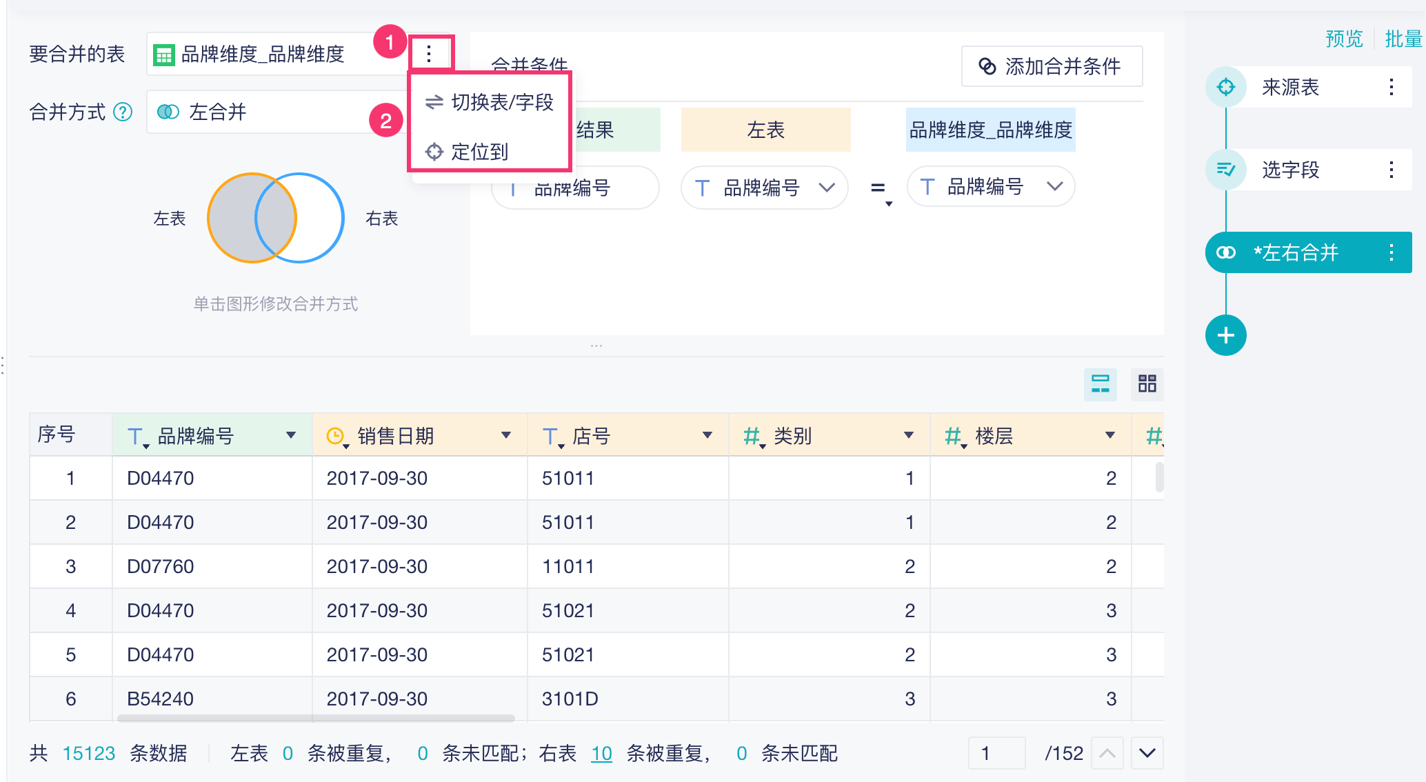 如果需要修改右表参与合并的字段,可以点击右表区域的「切换」按钮,重新选择参与计算的字段。也可以点击「定位到」直接对右表的数据进行「编辑」。