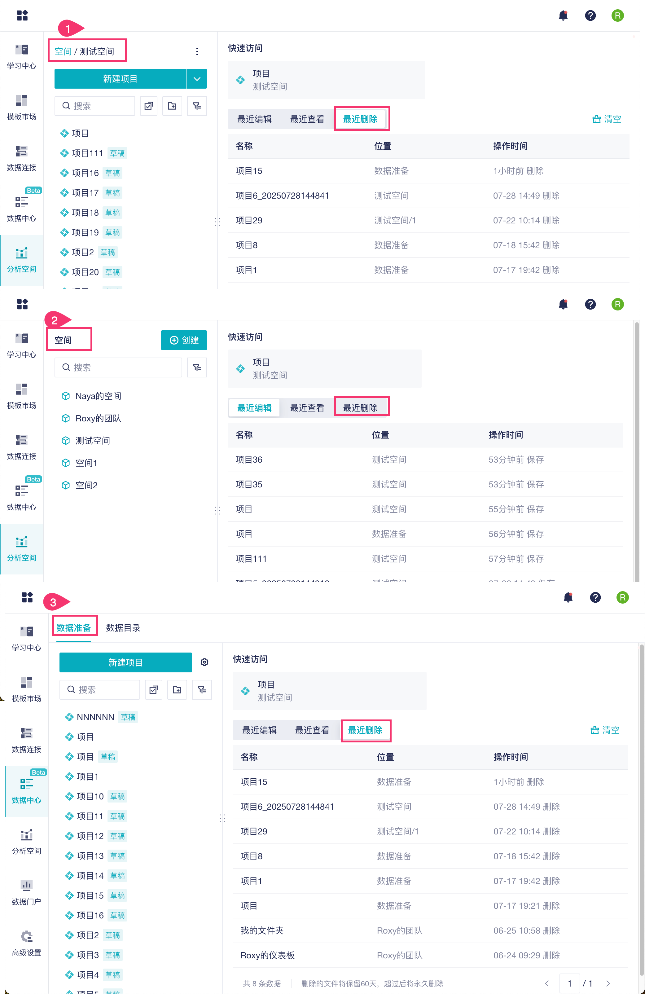 1)在企业层级、空间层级或者「数据中心」下,可以看到「最近删除」模块,如下图所示: