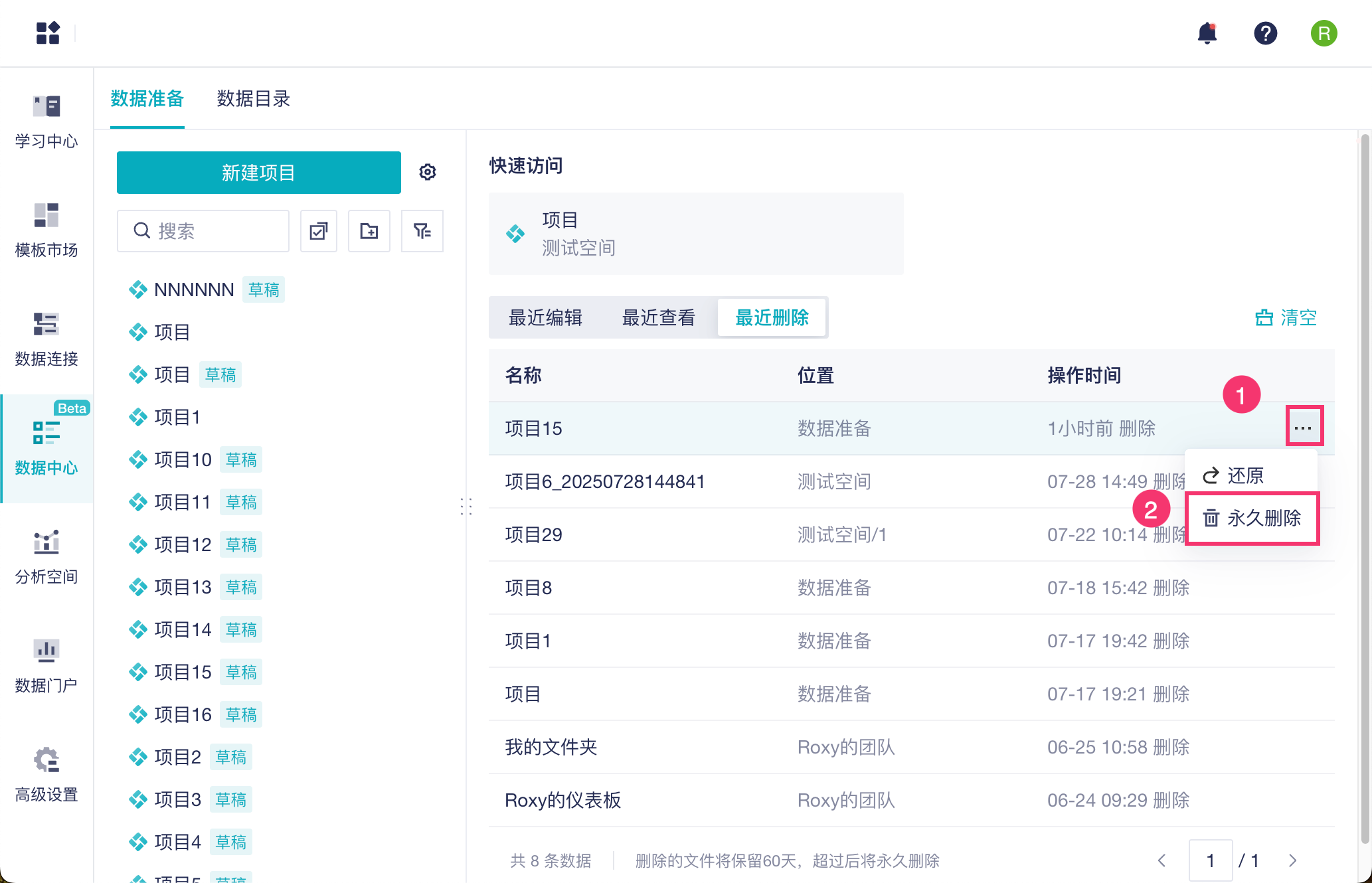 2)在这个模块中,展示当前成员删除的数据表、仪表板、故事板以及项目。如果想要一键清空所有最近删除的文件,可点击「清空」按钮,如下图所示: