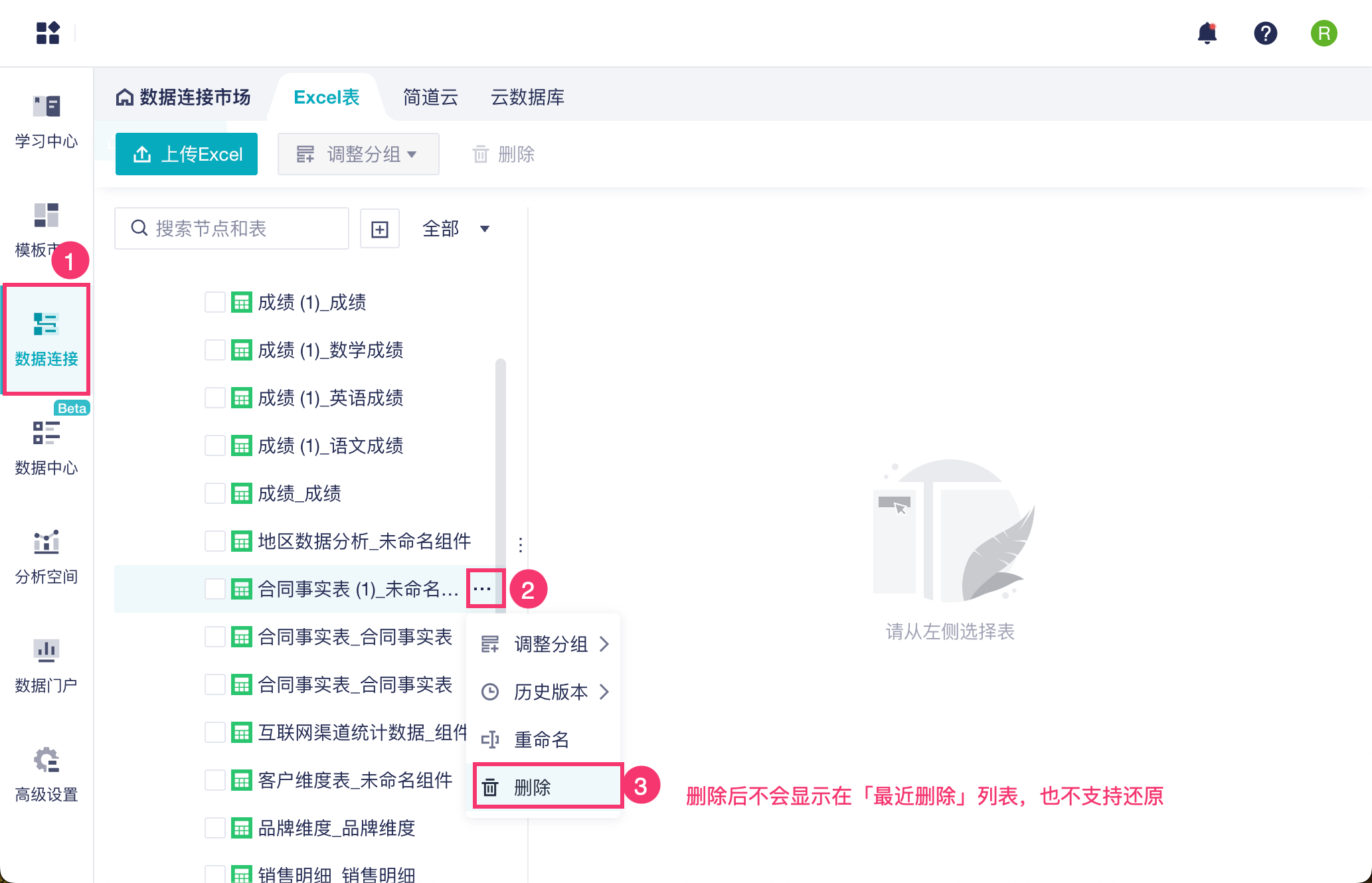 「最近删除」仅展示「分析空间」和「数据中心」模块下删除的文件内容,如果删除的是「数据连接」下的数据源表(下图以 Excel 数据源为例),是不会展示在「最近删除」列表中,删除数据源表也无法还原,请谨慎操作。