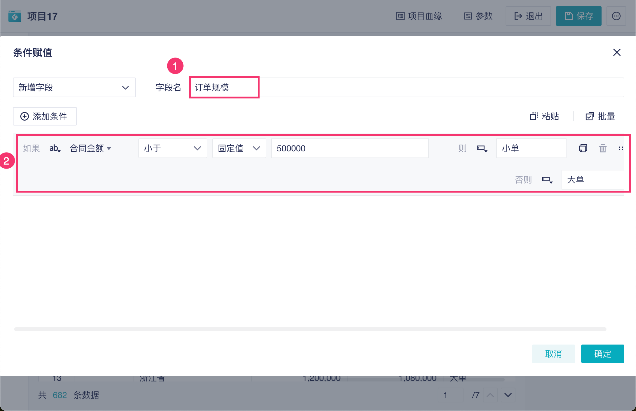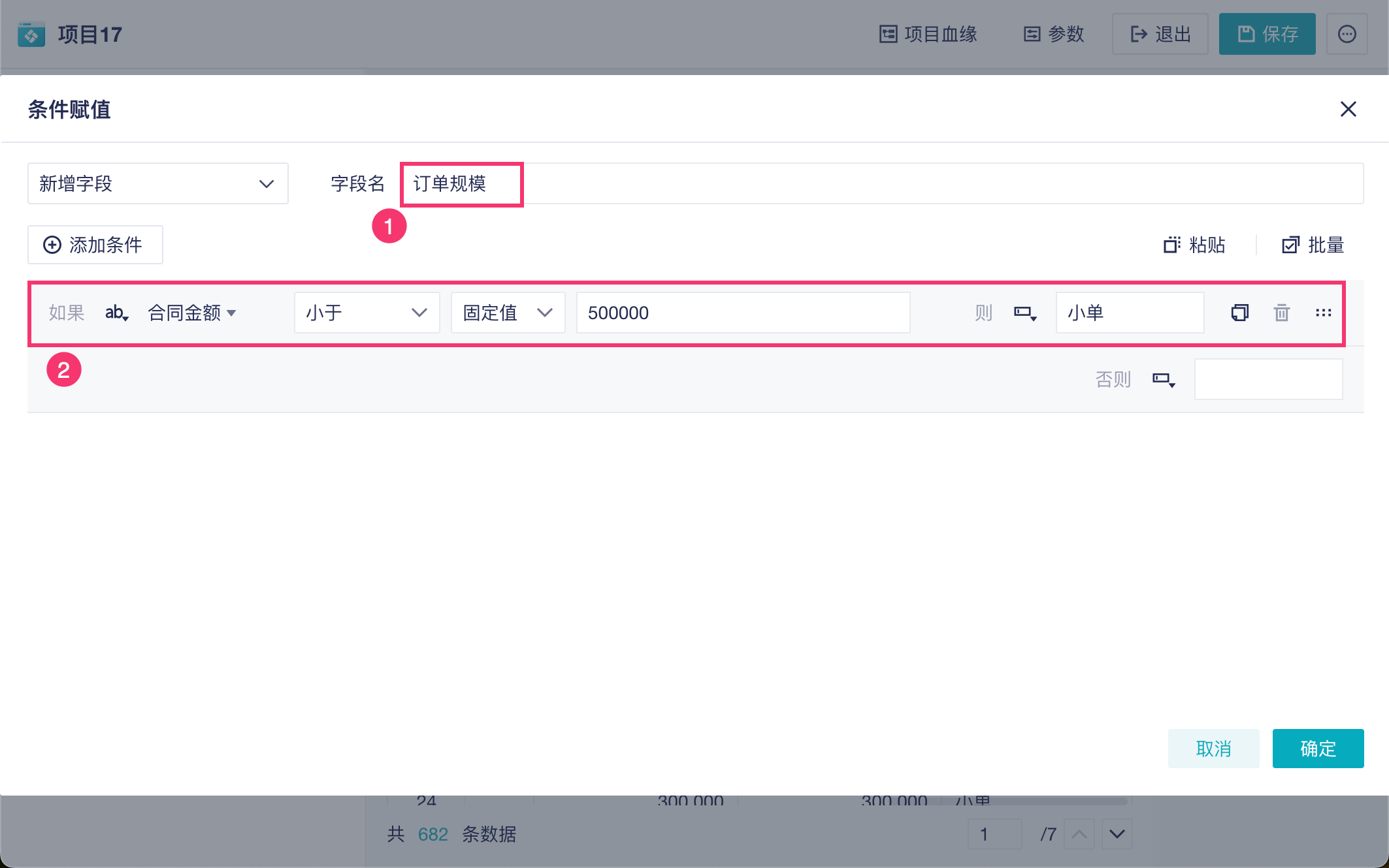 2)新增字段名为「订单规模」,设置第一个条件:合同金额<500000 的,归为小单。如下图所示: