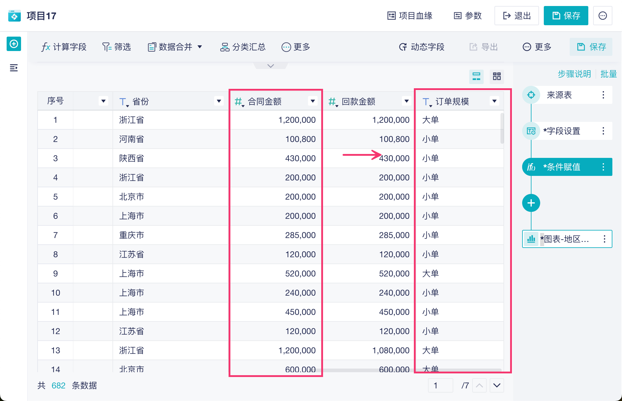 条件赋值可替代 IF/IFS 函数,实现复杂条件,在可视化窗口中,通过简单的参数设置,即可实现多条件分组赋值的效果: