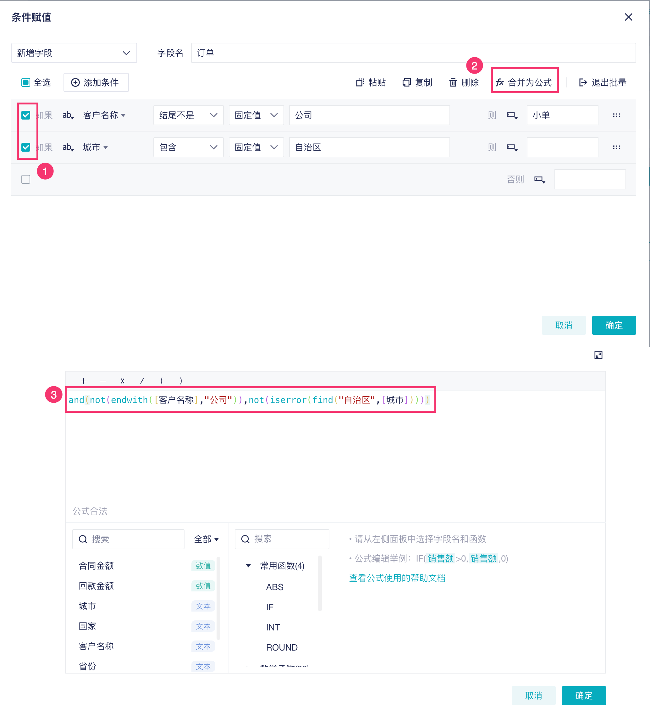 用户在写公式条件时,有些条件不知道如何用公式表达,比如开头是、结尾是、包含等等。可以先配置普通条件,再使用「合并为公式」将其转换成公式条件,在此基础上进行修改。如下图所示: