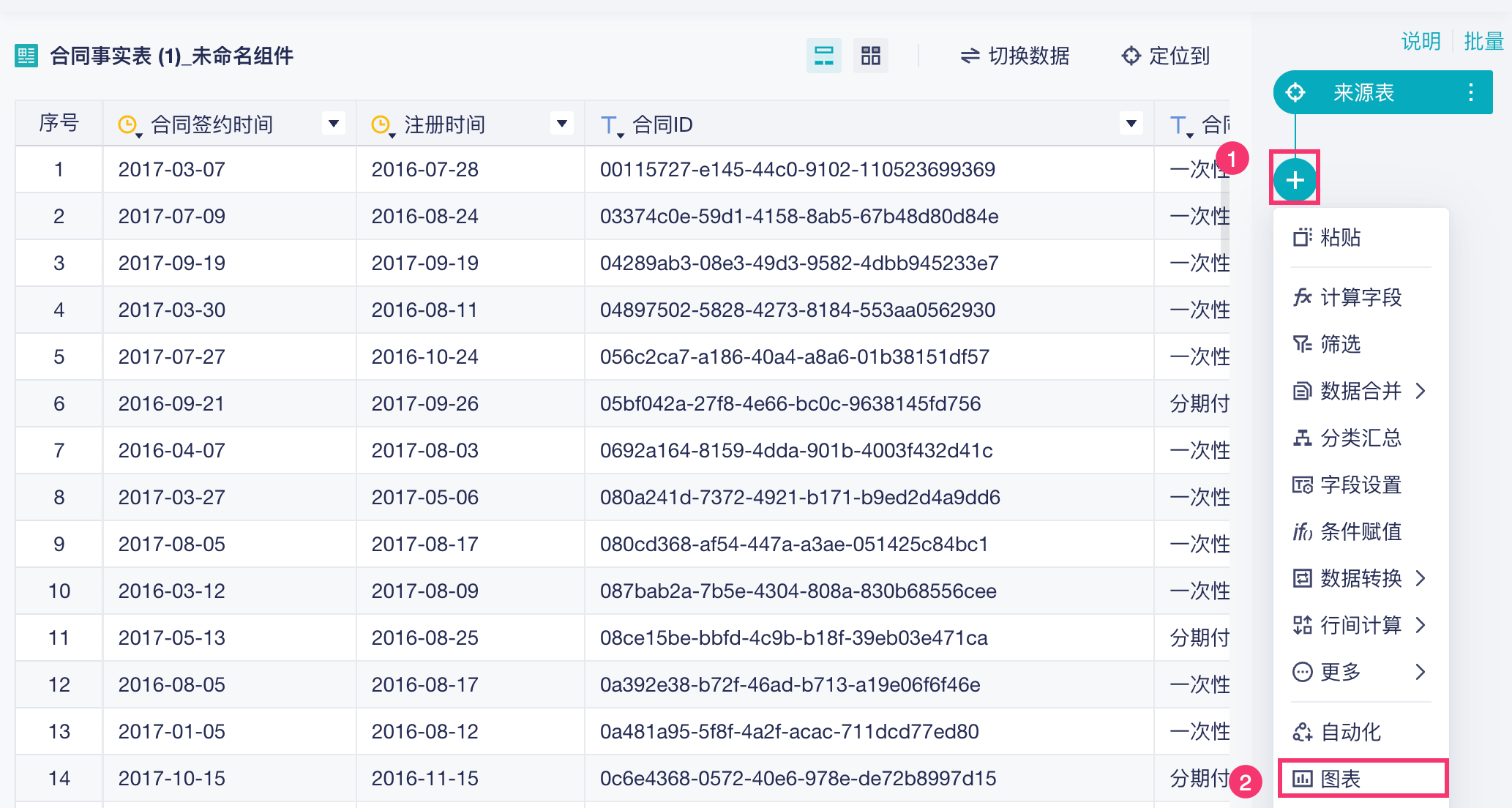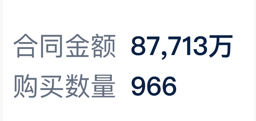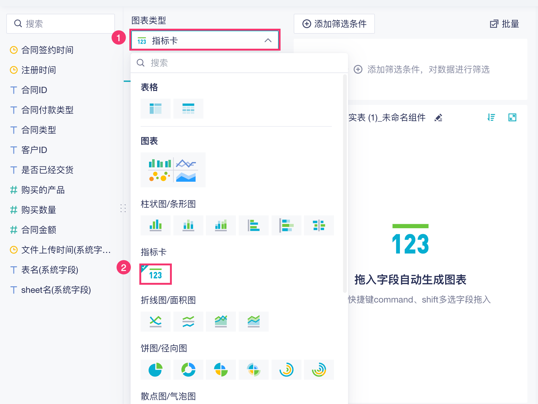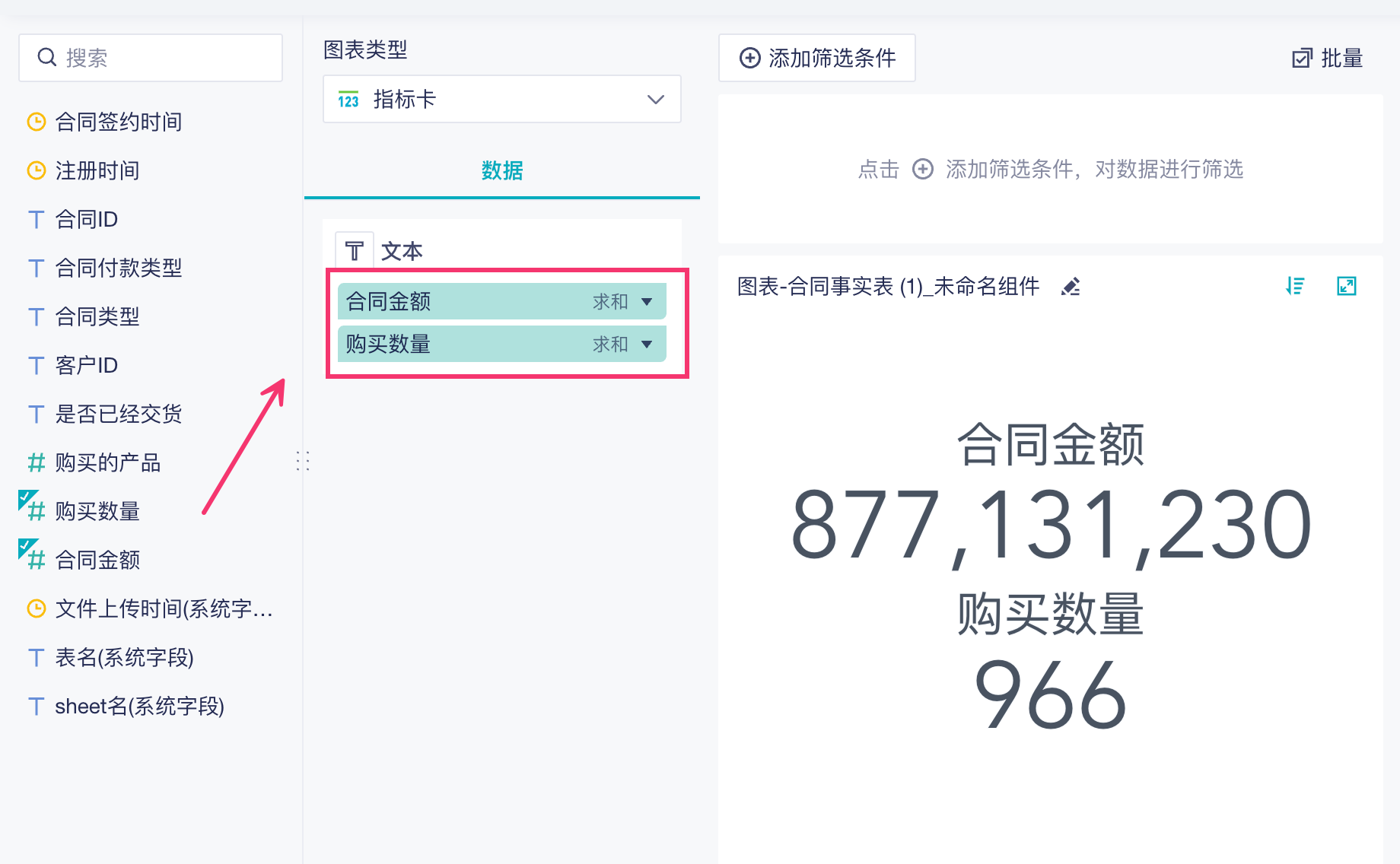 3)将「合同金额」、「购买数量」字段拖入文本,可以生成指标卡,如下图所示: