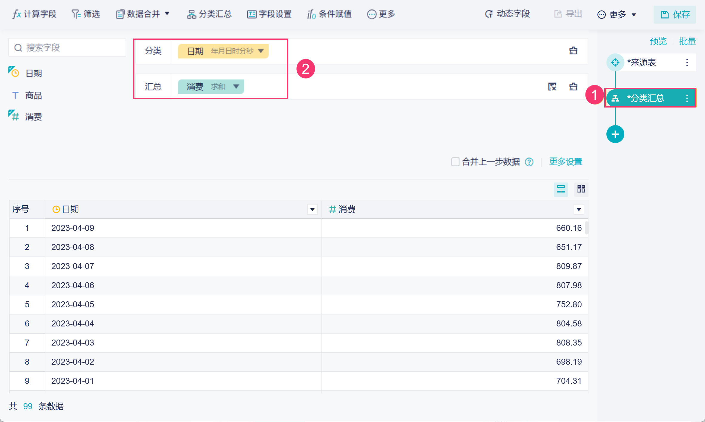 1)先添加「分类汇总」步骤,将「日期」拖入分类栏,将「消费」拖入指标栏,计算每天的消费总额,如下图所示:
