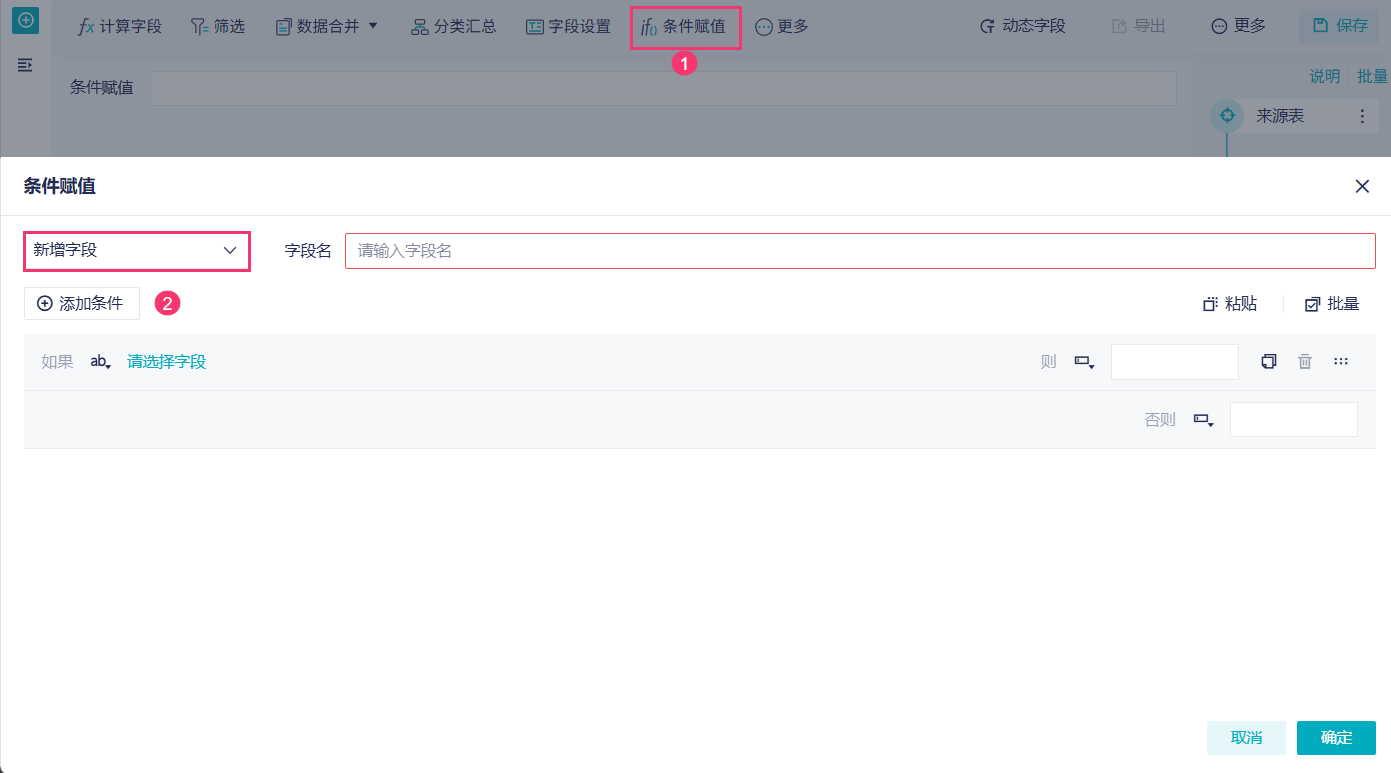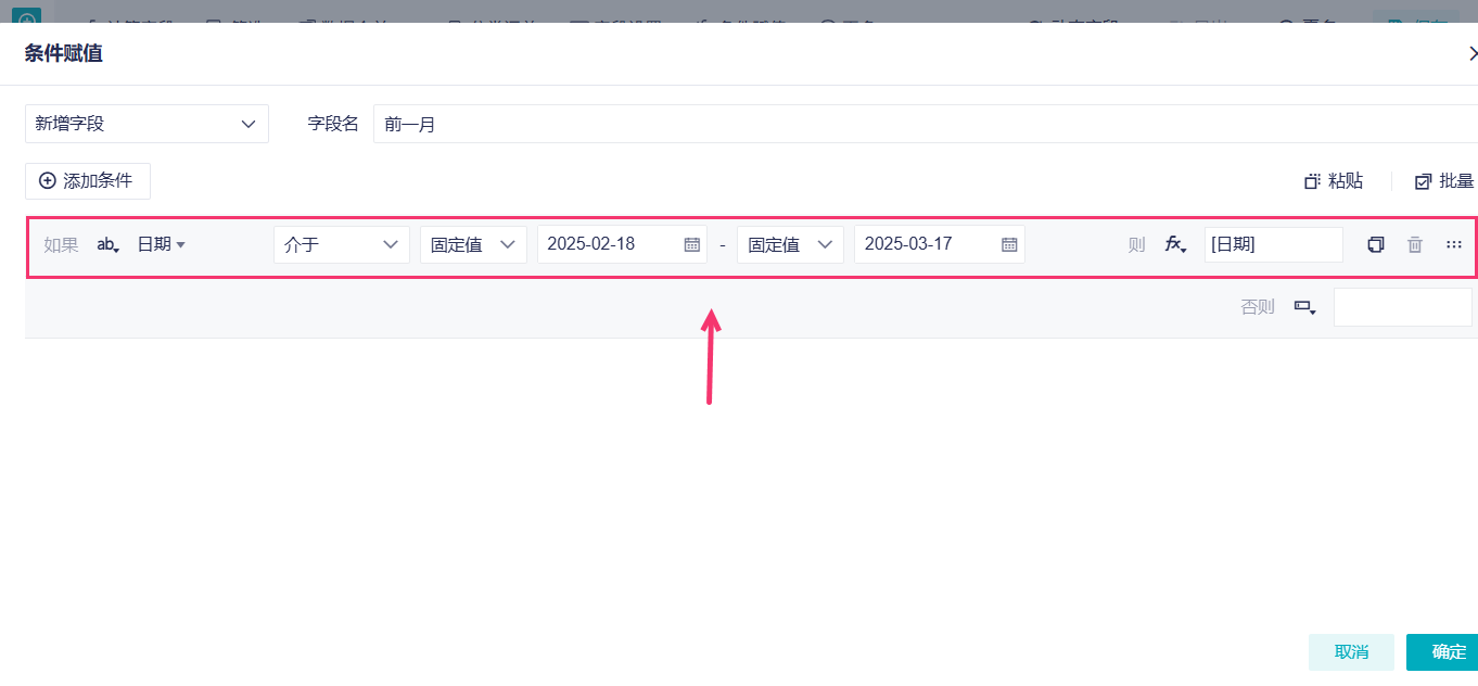 1)同样,使用「+>新增字段>条件赋值」获取前一月的日期。