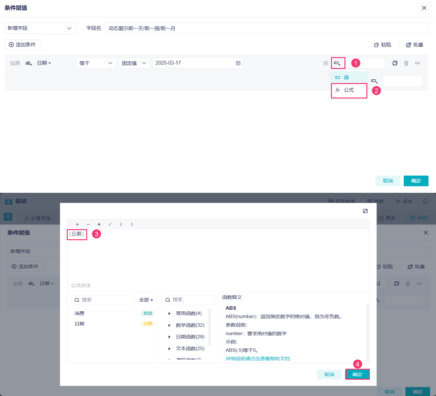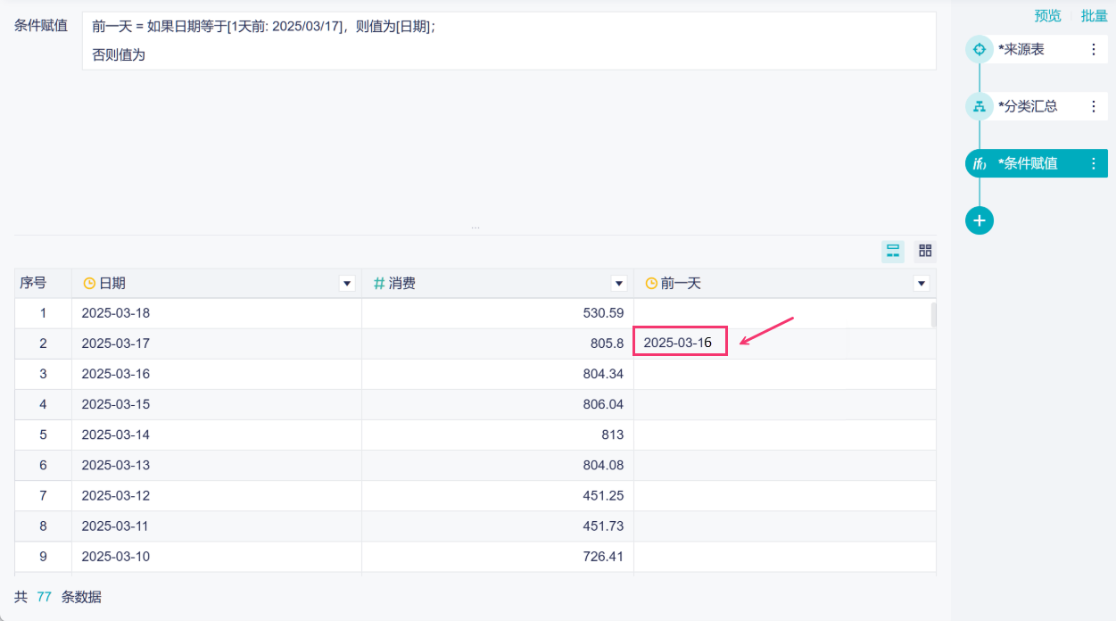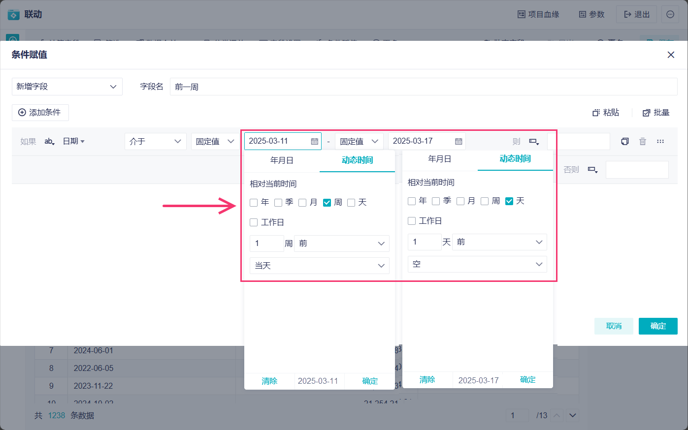 4)赋值条件:如果「日期」属于动态时间「一天前」,那么就展示「一天前」的值。如下图所示: